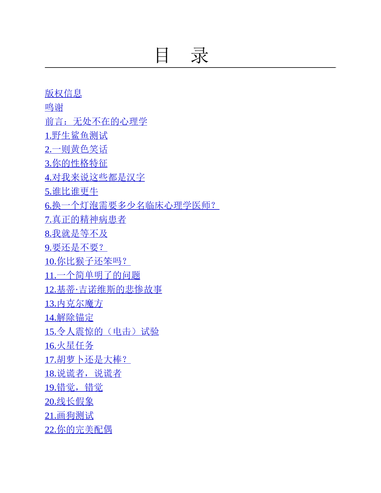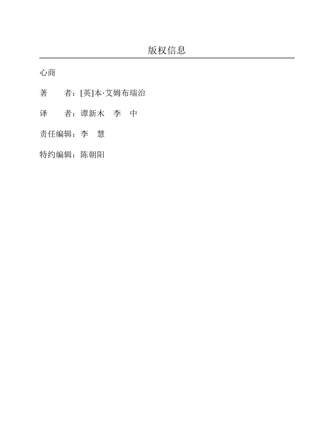 版权信息心商著者:[英]本·艾姆布瑞治译者:谭新木李中责任编辑:李慧特约编辑:陈朝阳目录版权信息鸣谢前言:无处不在的心理学1.野生鲨鱼测试2.一则黄色笑话3.你的性格特征4.对我来说这些都是汉字5.谁比谁更牛6.换一个灯泡需要多少名临床心理学医师?7.真正的精神病患者8.我就是等不及9.要还是不要?10.你比猴子还笨吗?11.一个简单明了的问题12.基蒂·吉诺维斯的悲惨故事13.内克尔魔方14.解除锚定15.令人震惊的(电击)试验16.火星任务17.胡萝卜还是大棒?18.说谎者,说谎者19.错觉,错觉20.线长假象21.画狗测试22.你的完美配偶23.网络爱情24.情人节:大崩溃?25.茶水测试26.阅读与自我纠错27.序曲还是催眠曲?28.患者29.放射线医师30.外科医生31.医生32.卫生部长33.红还是黑?34.追踪袭击者35.道德游戏36.艺术...