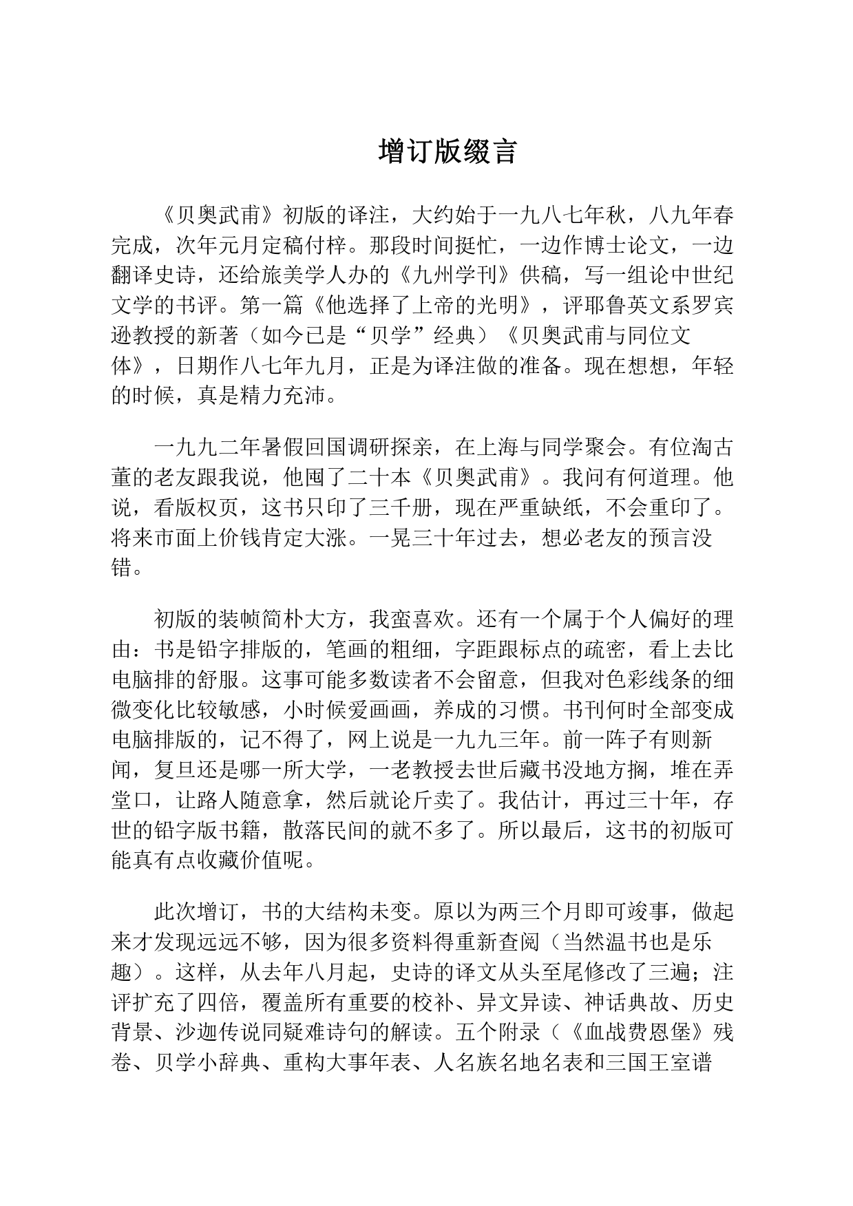 献给父母Wyrdoftnereðunfægneeorlonnehisellendeah增订版缀言《贝奥武甫》初版的译注,大约始于一九八七年秋,八九年春完成,次年元月定稿付梓。那段时间挺忙,一边作博士论文,一边翻译史诗,还给旅美学人办的《九州学刊》供稿,写一组论中世纪文学的书评。第一篇《他选择了上帝的光明》,评耶鲁英文系罗宾逊教授的新著(如今已是“贝学”经典)《贝奥武甫与同位文体》,日期作八七年九月,正是为译注做的准备。现在想想,年轻的时候,真是精力充沛。一九九二年暑假回国调研探亲,在上海与同学聚会。有位淘古董的老友跟我说,他囤了二十本《贝奥武甫》。我问有何道理。他说,看版权页,这书只印了三千册,现在严重缺纸,不会重印了。将来市面上价钱肯定大涨。一晃三十年过去,想必老友的预言没错。初版的装帧简...