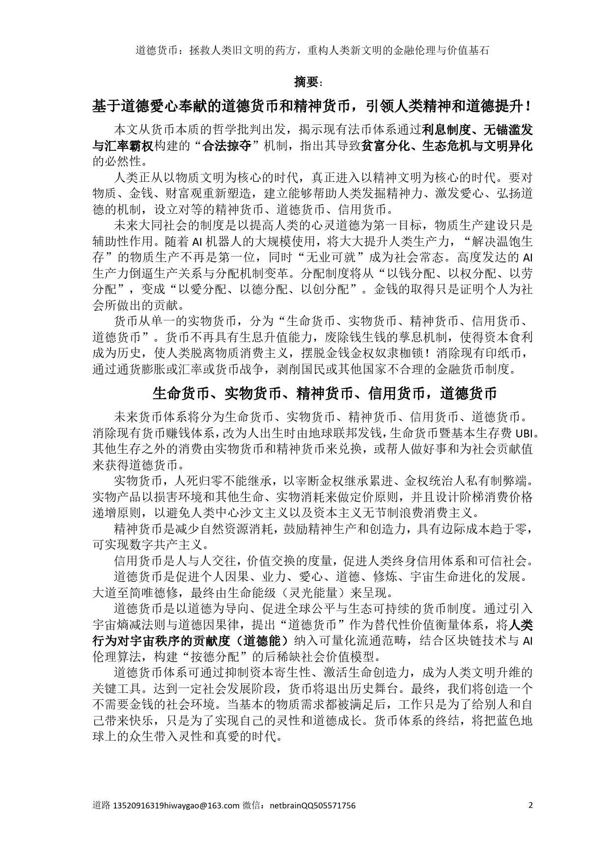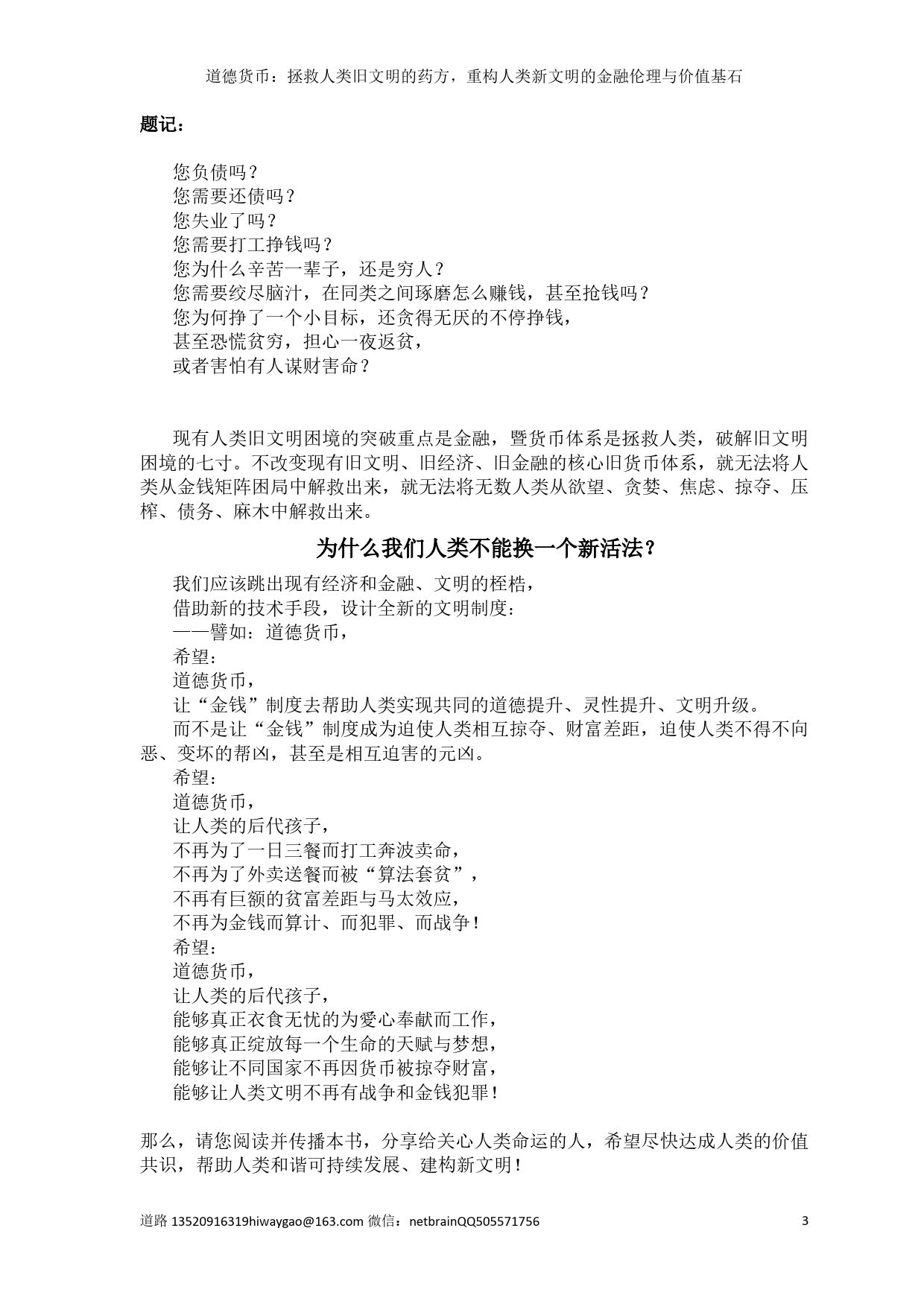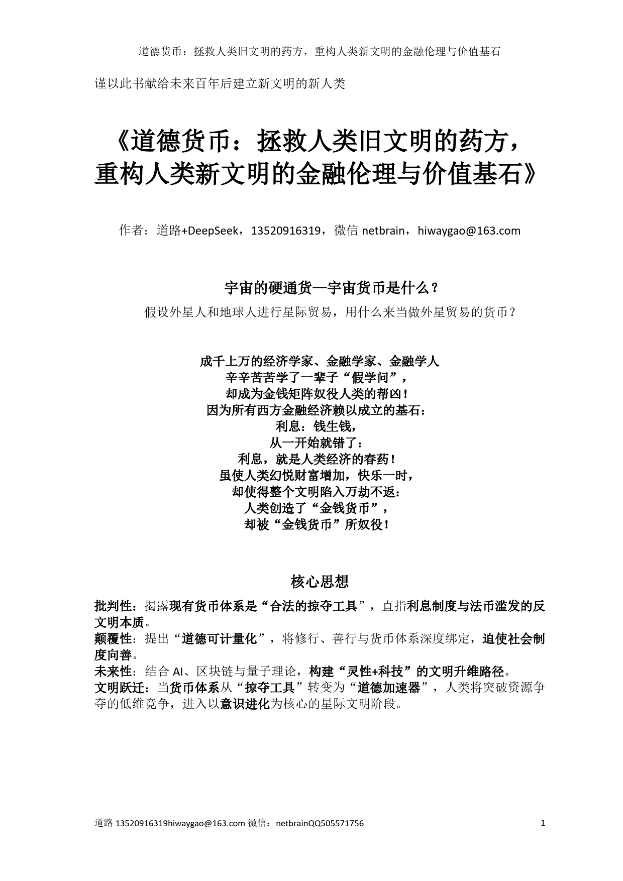 道德货币:拯救人类旧文明的药方,重构人类新文明的金融伦理与价值基石谨以此书献给未来百年后建立新文明的新人类《道德货币:拯救人类旧文明的药方,重构人类新文明的金融伦理与价值基石》作者:道路+DeepSeek,13520916319,微信netbrain,hiwaygao@163.com宇宙的硬通货—宇宙货币是什么?假设外星人和地球人进行星际贸易,用什么来当做外星贸易的货币?成千上万的经济学家、金融学家、金融学人辛辛苦苦学了一辈子“假学问”,却成为金钱矩阵奴役人类的帮凶!因为所有西方金融经济赖以成立的基石:利息:钱生钱,从一开始就错了:利息,就是人类经济的春药!虽使人类幻悦财富增加,快乐一时,却使得整个文明陷入万劫不返:人类创造了“金钱货币”,却被“金钱货币”所奴役!核心思想批判性:揭露现有货币体系是...
