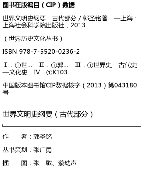 世界文明史纲要(古代部分)郭圣铭著上海社会科学院出版社图书在版编目(CIP)数据世界文明史纲要.古代部分/郭圣铭著.—上海:上海社会科学院出版社,2013(世界历史文化丛书)ISBN978-7-5520-0236-2Ⅰ.①世…Ⅱ.①郭…Ⅲ.①世界史—古代史—文化史Ⅳ.①K103中国版本图书馆CIP数据核字(2013)第043180号世界文明史纲要(古代部分)作者:郭圣铭丛书策划:张广勇插图:张敏、蔡幼声责任编辑:张广勇封面设计:闵敏出版发行:上海社会科学院出版社上海淮海中路622弄7号电话63875741邮编200020http://www.sassp.org.cnE-mail:sassp@sass.org.cn经销:新华书店照排:南京展望文化发展有限公司印刷:上海中华印刷有限公司开本:710×1010毫米1/16开印张:25.25插页:2字数:438千字版次:2013年6月第1版2013年6...