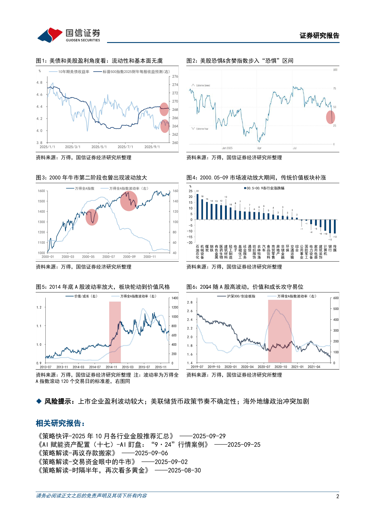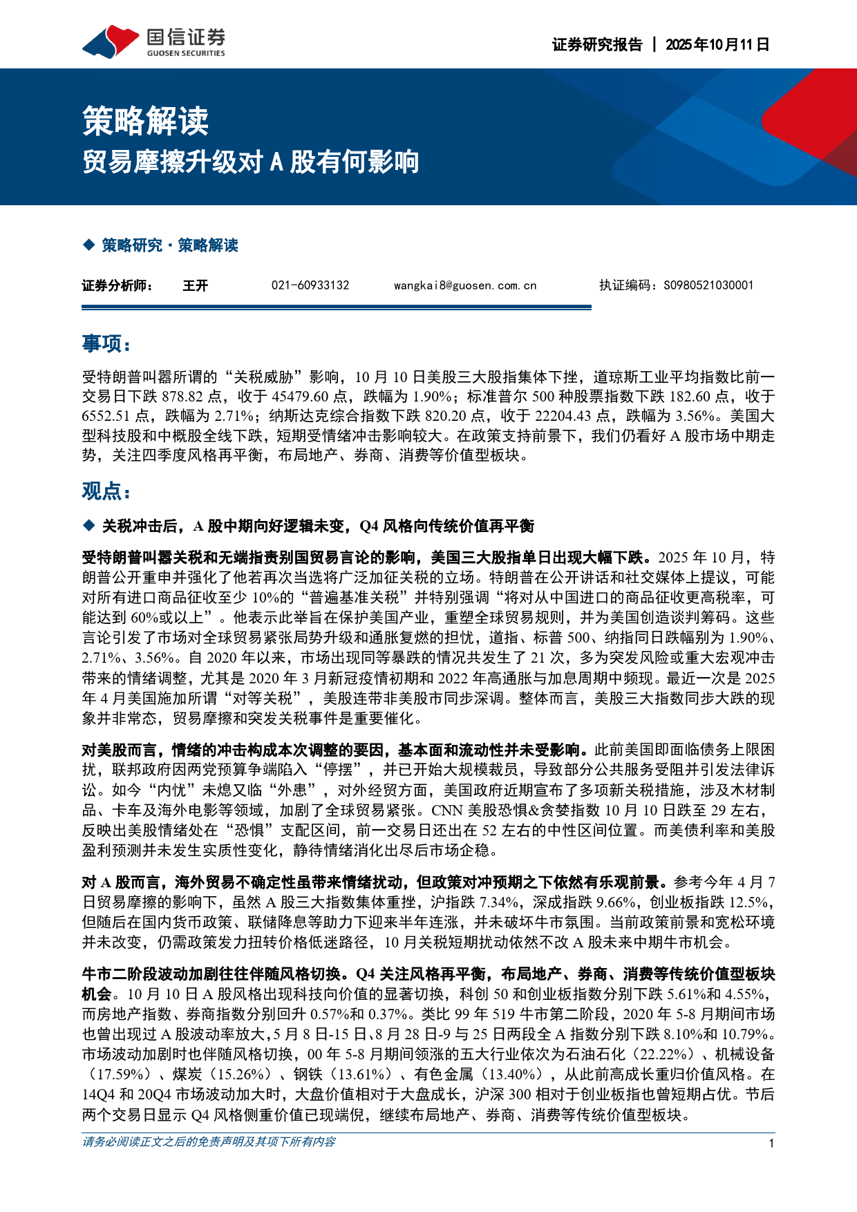 证券研究报告2025年10月11日策略解读贸易摩擦升级对A股有何影响策略研究·策略解读021-60933132wangkai8@guosen.com.cn执证编码:S0980521030001证券分析师:王开事项:受特朗普叫嚣所谓的“关税威胁”影响,10月10日美股三大股指集体下挫,道琼斯工业平均指数比前一交易日下跌878.82点,收于45479.60点,跌幅为1.90%;标准普尔500种股票指数下跌182.60点,收于6552.51点,跌幅为2.71%;纳斯达克综合指数下跌820.20点,收于22204.43点,跌幅为3.56%。美国大型科技股和中概股全线下跌,短期受情绪冲击影响较大。在政策支持前景下,我们仍看好A股市场中期走势,关注四季度风格再平衡,布局地产、券商、消费等价值型板块。观点:关税冲击后,A股中期向好逻辑未变,Q4风格向传统价值再平衡受特朗普叫嚣关税和无端...