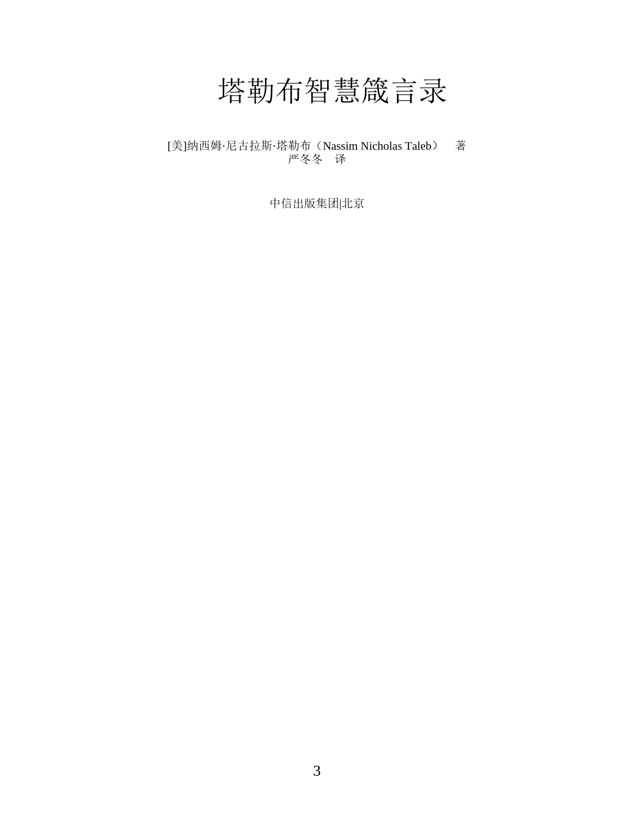 2塔勒布智慧箴言录[美]纳西姆·尼古拉斯·塔勒布(NassimNicholasTaleb)著严冬冬译中信出版集团北京3目录封面扉页塔勒布智慧箴言录普罗克拉斯提斯前言逆向叙述本体论神圣与凡俗机遇、成功、幸福与坚忍迷人的和不那么迷人的愚人问题像古代人一样生活文字共和国普遍与特殊被随机性愚弄美学伦理强大与脆弱游戏谬误和场地依赖认识论和减法知识4预言的丑闻成为哲学家,并为之继续努力经济生活及其他庸俗议题贤者、弱者和伟大者隐含的和明确的爱与非爱结尾后记致谢THEBEDOFPROCRUSTESPROCRUSTESPRELUDESCOUNTERNARRATIVESMATTERSONTOLOGICALTHESACREDANDTHEPROFANECHANCE,SUCCESS,HAPPINESS,ANDSTOICISMCHARMINGANDLESSCHARMINGSUCKERPROBLEMSTHESEUS,ORLIVINGTHEPALEOLIFETHEREPUBLICOFLETTERSTHEUNIVERSALANDTHEPARTI...