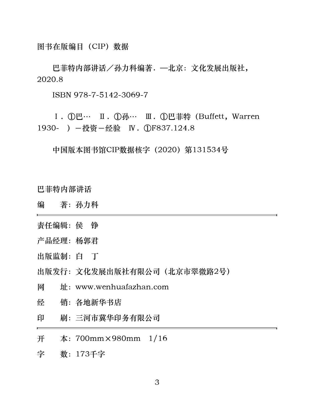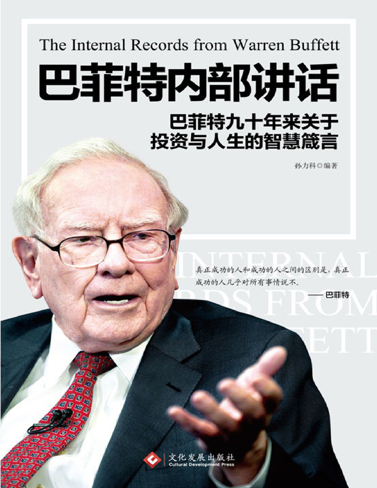 2图书在版编目(CIP)数据巴菲特内部讲话/孙力科编著.—北京:文化发展出版社,2020.8ISBN978-7-5142-3069-7Ⅰ.①巴…Ⅱ.①孙…Ⅲ.①巴菲特(Buffett,Warren1930-)-投资-经验Ⅳ.①F837.124.8中国版本图书馆CIP数据核字(2020)第131534号巴菲特内部讲话编著:孙力科责任编辑:侯铮产品经理:杨郭君出版监制:白丁出版发行:文化发展出版社有限公司(北京市翠微路2号)网址:www.wenhuafazhan.com经销:各地新华书店印刷:三河市冀华印务有限公司开本:700mm×980mm1/16字数:173千字3印张:16版次:2020年9月第1版2020年9月第1次印刷ISBN:978-7-5142-3069-7定价:45.00元本书若有质量问题,请拨打电话:010-820693364前言谈论巴菲特一直都是不容易的话题,写关于巴菲特的书更是困难,因为人们对他太了...