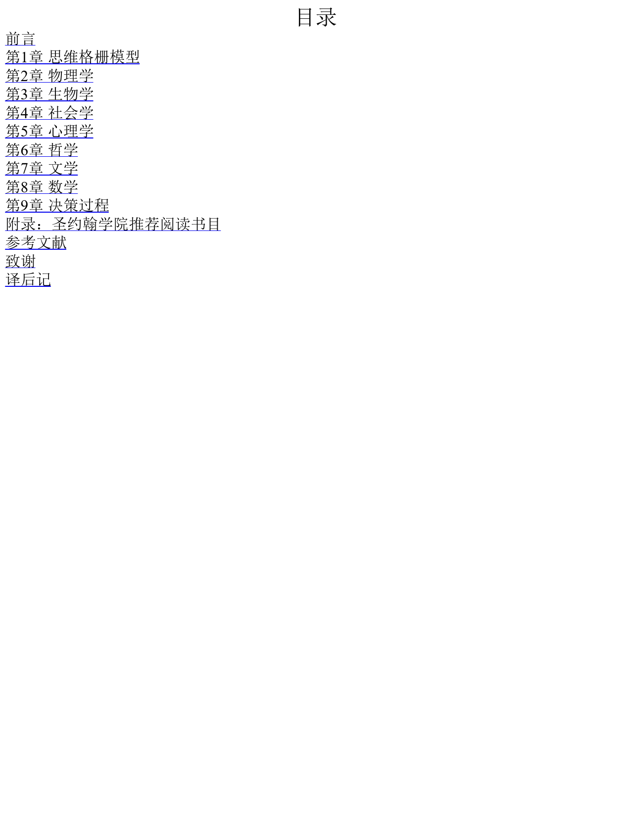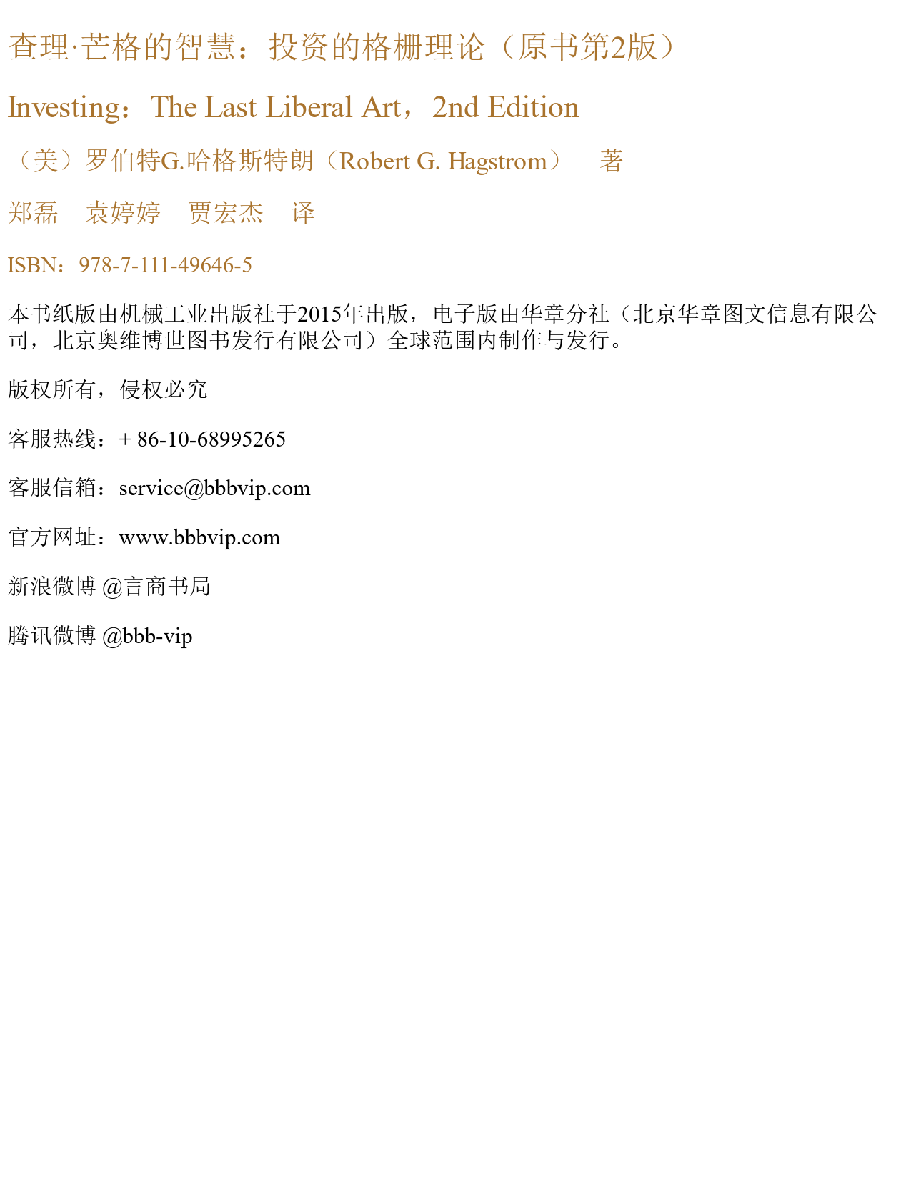 查理·芒格的智慧:投资的格栅理论(原书第2版)Investing:TheLastLiberalArt,2ndEdition(美)罗伯特G.哈格斯特朗(RobertG.Hagstrom)著郑磊袁婷婷贾宏杰译ISBN:978-7-111-49646-5本书纸版由机械工业出版社于2015年出版,电子版由华章分社(北京华章图文信息有限公司,北京奥维博世图书发行有限公司)全球范围内制作与发行。版权所有,侵权必究客服热线:+86-10-68995265客服信箱:service@bbbvip.com官方网址:www.bbbvip.com新浪微博@言商书局腾讯微博@bbb-vip目录前言第1章思维格栅模型第2章物理学第3章生物学第4章社会学第5章心理学第6章哲学第7章文学第8章数学第9章决策过程附录:圣约翰学院推荐阅读书目参考文献致谢译后记前言2000年,我写了一本书,书名是《从牛顿、达尔文到巴菲特:投资的格栅理论》...