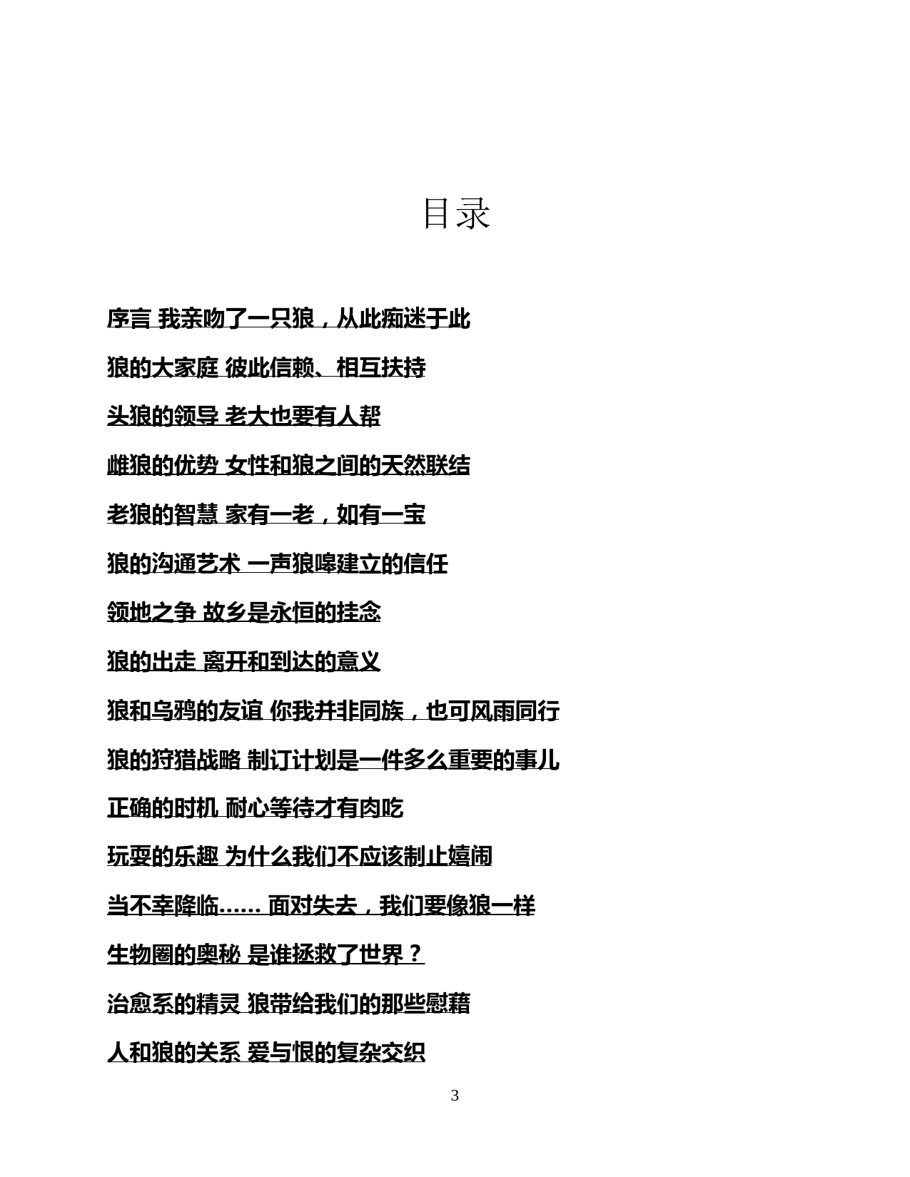 狼的智慧——我的25年荒野观狼之旅[德]埃莉·H.拉丁格著张静赵莉妍译中信出版集团2目录序言我亲吻了一只狼,从此痴迷于此狼的大家庭彼此信赖、相互扶持头狼的领导老大也要有人帮雌狼的优势女性和狼之间的天然联结老狼的智慧家有一老,如有一宝狼的沟通艺术一声狼嗥建立的信任领地之争故乡是永恒的挂念狼的出走离开和到达的意义狼和乌鸦的友谊你我并非同族,也可风雨同行狼的狩猎战略制订计划是一件多么重要的事儿正确的时机耐心等待才有肉吃玩耍的乐趣为什么我们不应该制止嬉闹当不幸降临……面对失去,我们要像狼一样生物圈的奥秘是谁拯救了世界?治愈系的精灵狼带给我们的那些慰藉人和狼的关系爱与恨的复杂交织3欢迎狼的到来在德国有野狼的日子尾声W.W.W.D附录在黄石公园和德国境内观狼小贴士致谢参考文献图片来...