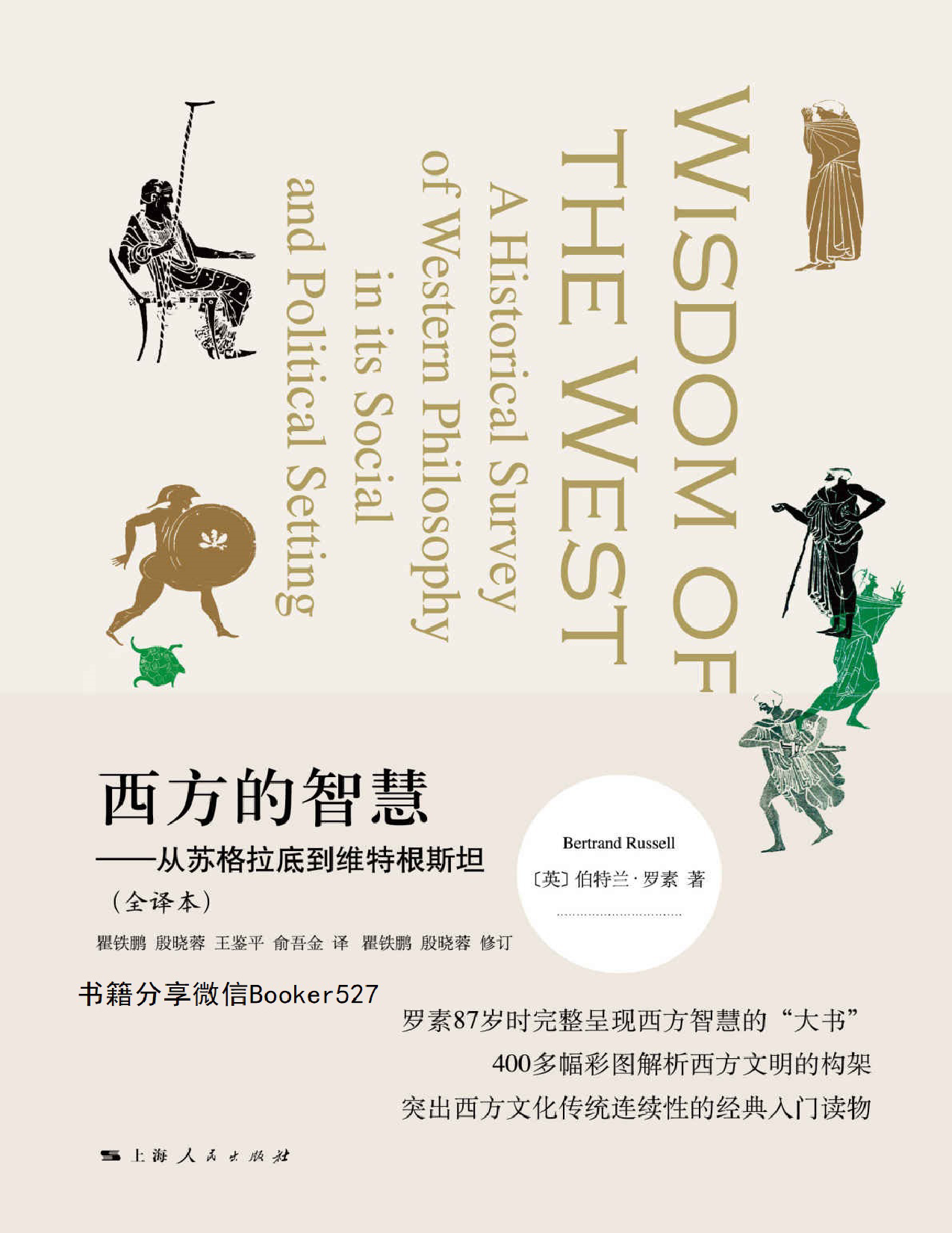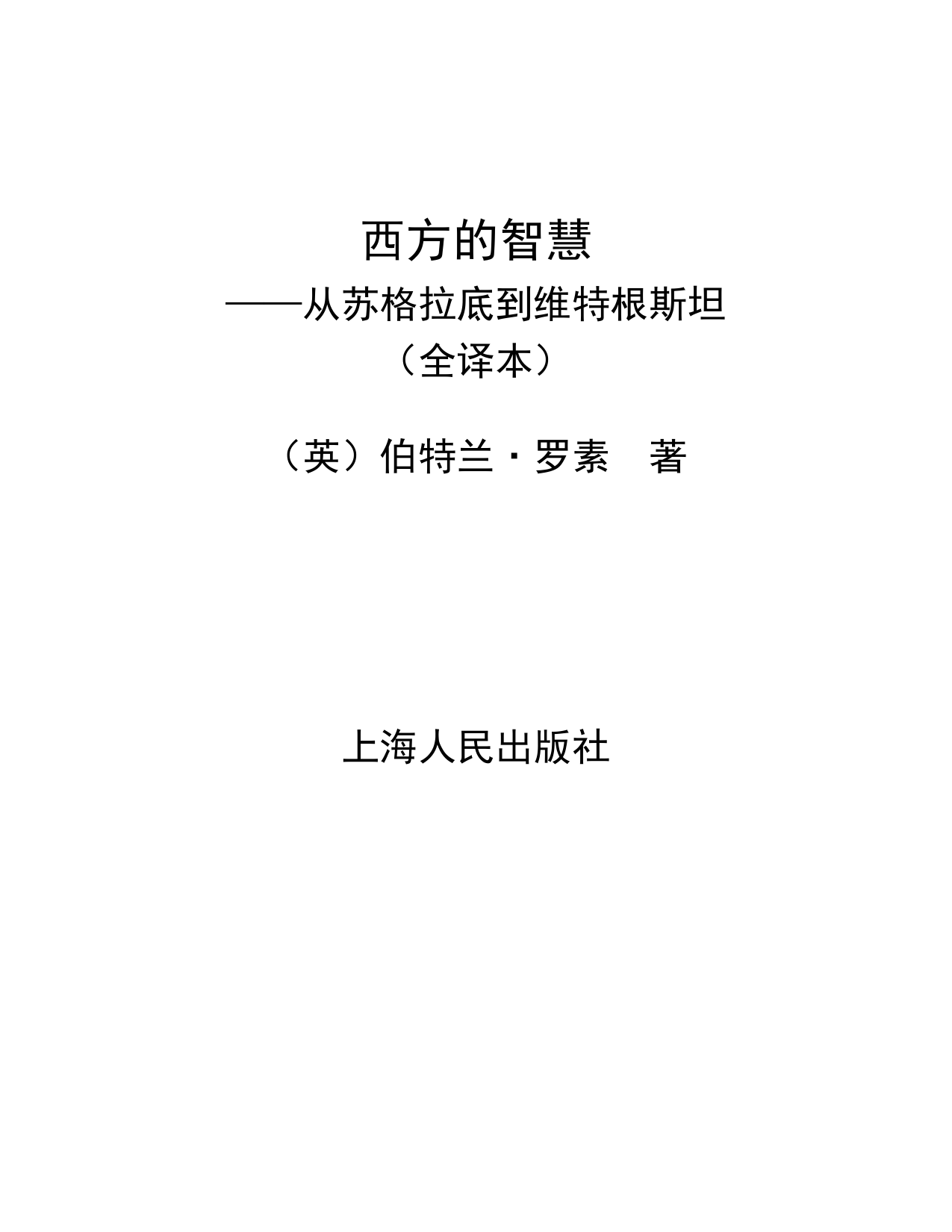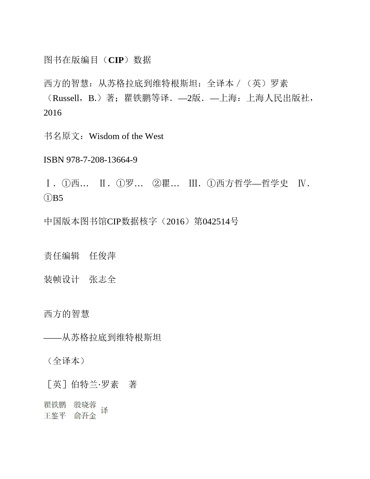 西方的智慧——从苏格拉底到维特根斯坦(全译本)(英)伯特兰·罗素著上海人民出版社图书在版编目(CIP)数据西方的智慧:从苏格拉底到维特根斯坦:全译本/(英)罗素(Russell,B.)著;瞿铁鹏等译.—2版.—上海:上海人民出版社,2016书名原文:WisdomoftheWestISBN978-7-208-13664-9Ⅰ.①西…Ⅱ.①罗…②瞿…Ⅲ.①西方哲学—哲学史Ⅳ.①B5中国版本图书馆CIP数据核字(2016)第042514号责任编辑任俊萍装帧设计张志全西方的智慧——从苏格拉底到维特根斯坦(全译本)[英]伯特兰·罗素著瞿铁鹏殷晓蓉修订世纪出版集团上海出版(200001上海福建中路193号www.ewen.co)世纪出版集团发行中心发行上海中华印刷有限公司印刷开本720×10001/16印张24插页4字数334,0002017年1月第2版2017年1月第1次印刷ISBN978-...