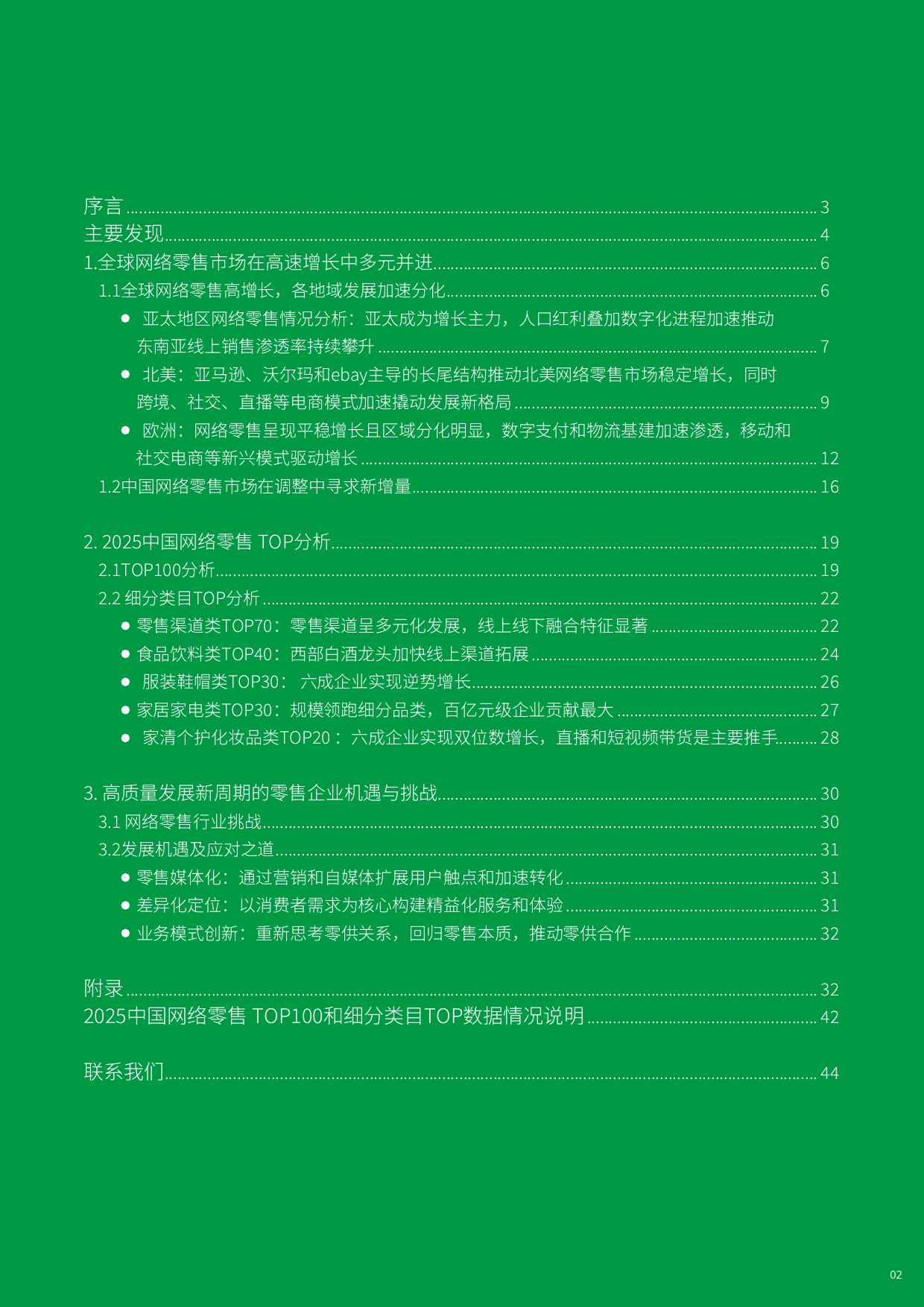 全球脉动和中国新动力2025年中国网络零售TOP100报告德勤中国&中国连锁经营协会2025年9月01序言..................................................................................................................................................................�主要发现.........................................................................................................................................................��.全球网络零售市场在高速增长中多元并进..........................................................................................��.�全球网络零售高增长,各地域发展加速分化.............................................................................