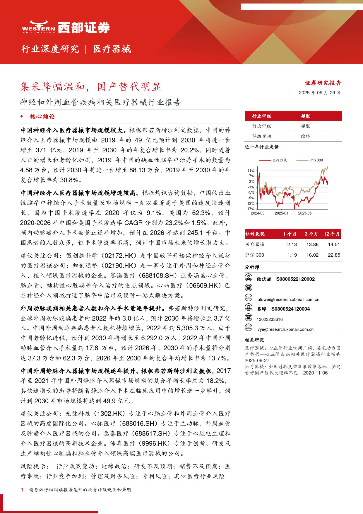 行业深度研究医疗器械集采降幅温和,国产替代明显证券研究报告神经和外周血管疾病相关医疗器械行业报告2025年09月29日核心结论行业评级超配前次评级超配中国神经介入医疗器械市场规模较大。根据弗若斯特沙利文数据,中国的神评级变动维持经介入医疗器械市场规模由2019年的49亿元预计到2030年将进一步近一年行业走势增至371亿元,2019年至2030年的年复合增长率为20.2%。同时随着沪深300人口的增长和老龄化加剧,2019年中国的缺血性脑卒中治疗手术的数量为11%医疗器械4.58万台,预计2030年将进一步增至88.13万台,2019年至2030年的年7%2025-012025-05复合增长率为30.8%。3%-1%中国神经介入医疗器械市场规模增速较高。根据灼识咨询数据,中国的出血-5%性脑卒中神经介入手术数量及市场规模一直以显著高于美国的速度...