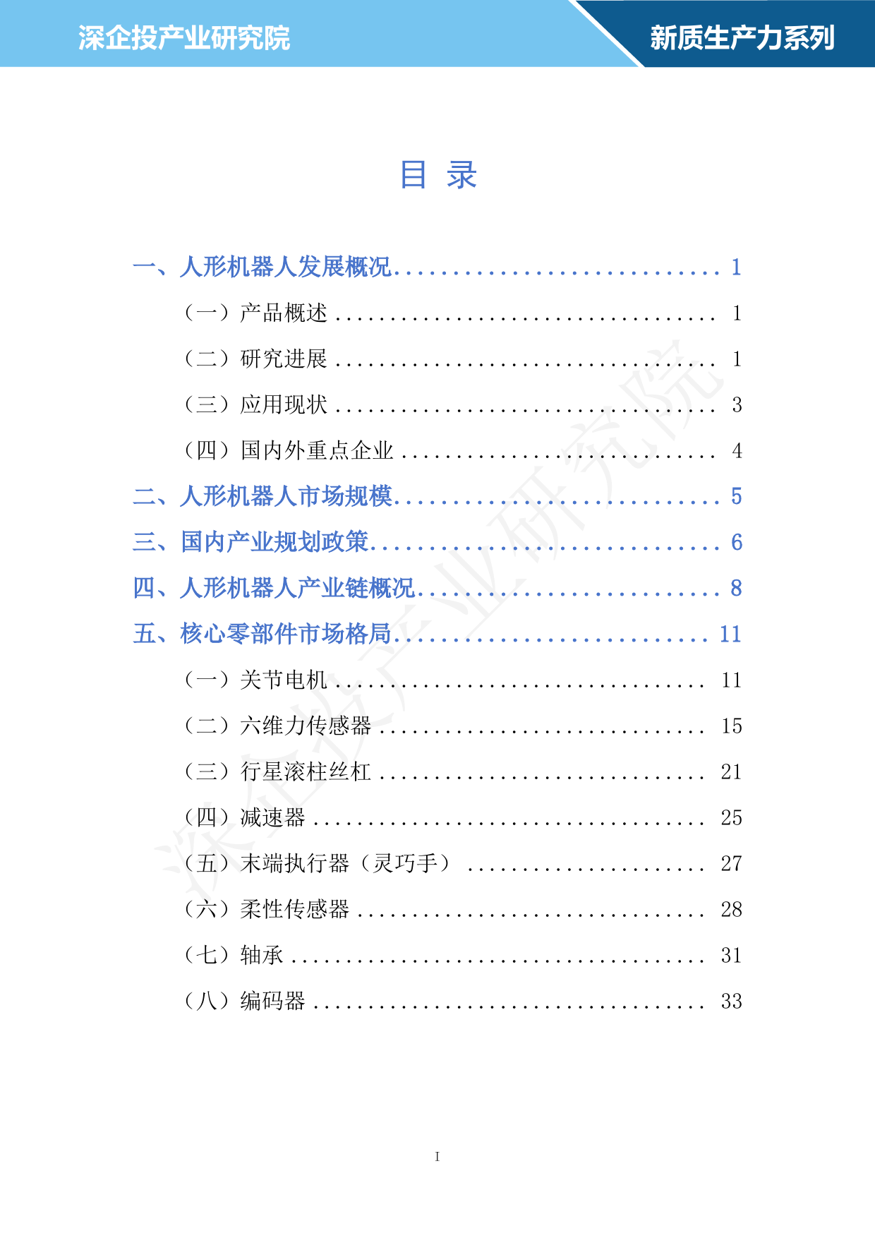 2024行业研究系列报告人形机器人行业研究报告!"#$%&'()+%,-./01234456712024年4月深企投产业研究院新质生产力系列!"#""一、人形机器人发展概况............................1(一)产品概述...................................1(二)研究进展...................................1(三)应用现状...................................3(四)国内外重点企业.............................4二、人形机器人市场规模............................5三、国内产业规划政策..............................6四、人形机器人产业链概况..........................8五、核心零部件市场格局...........................11(一)关节电机..................................11(二)六维力传感器................................
