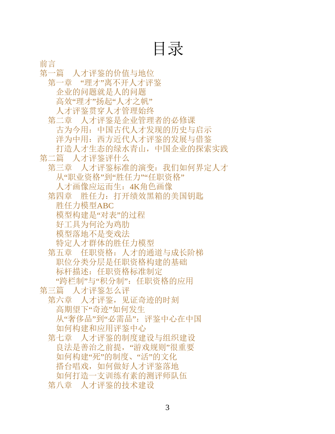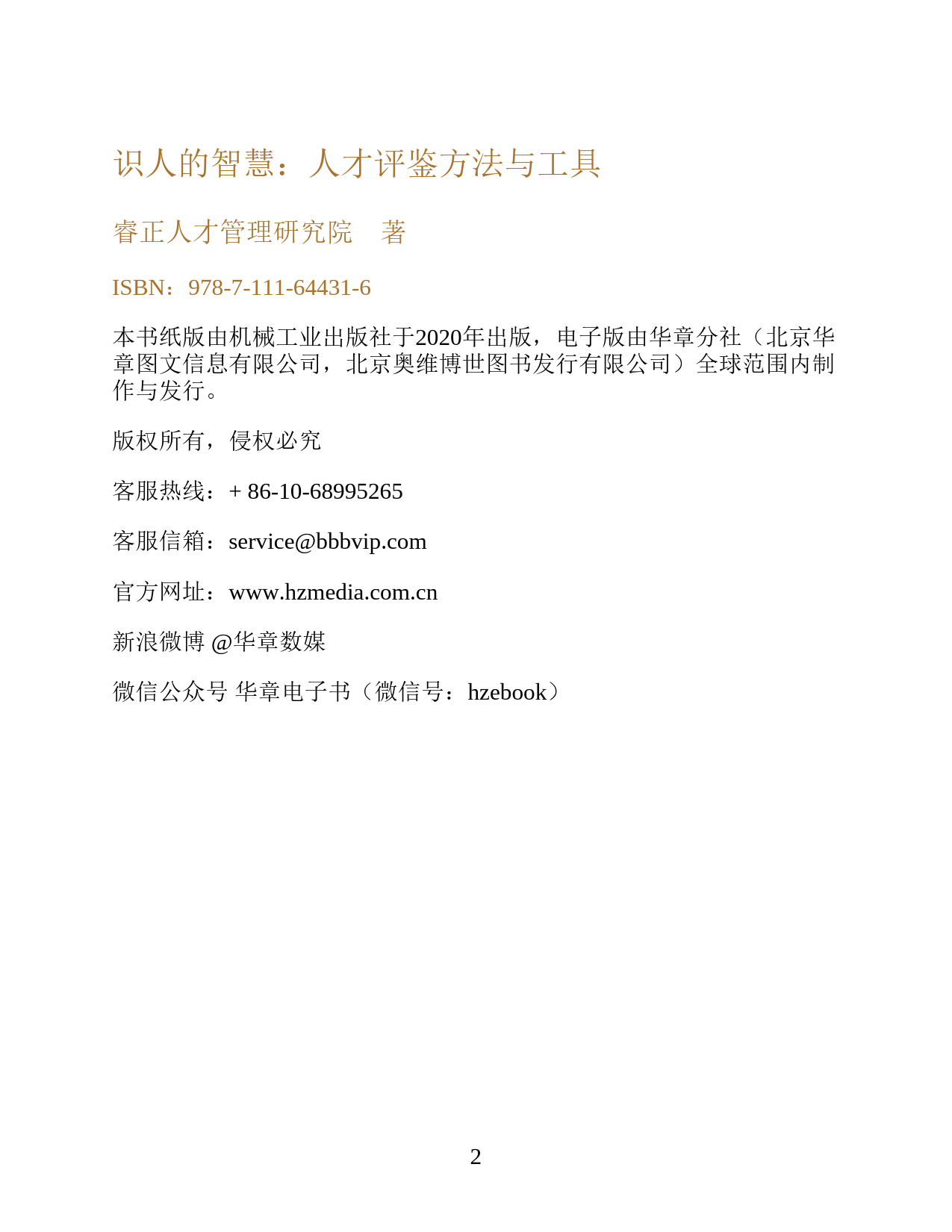 识人的智慧:人才评鉴方法与工具睿正人才管理研究院著ISBN:978-7-111-64431-6本书纸版由机械工业出版社于2020年出版,电子版由华章分社(北京华章图文信息有限公司,北京奥维博世图书发行有限公司)全球范围内制作与发行。版权所有,侵权必究客服热线:+86-10-68995265客服信箱:service@bbbvip.com官方网址:www.hzmedia.com.cn新浪微博@华章数媒微信公众号华章电子书(微信号:hzebook)2目录前言第一篇人才评鉴的价值与地位第一章“理才”离不开人才评鉴企业的问题就是人的问题高效“理才”扬起“人才之帆”人才评鉴贯穿人才管理始终第二章人才评鉴是企业管理者的必修课古为今用:中国古代人才发现的历史与启示洋为中用:西方近代人才评鉴的发展与借鉴打造人才生态的绿水青山,中国企业的探索实践第二篇人才评...