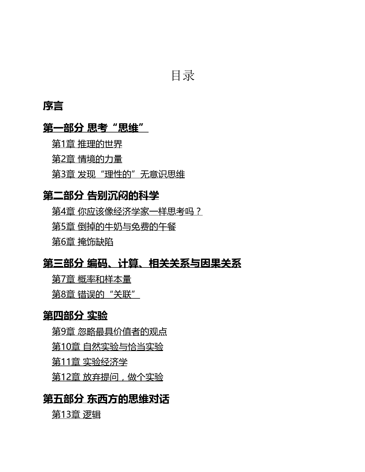 逻辑思维[美]理查德·尼斯贝特著张媚译中信出版社目录序言第一部分思考“思维”第1章推理的世界第2章情境的力量第3章发现“理性的”无意识思维第二部分告别沉闷的科学第4章你应该像经济学家一样思考吗?第5章倒掉的牛奶与免费的午餐第6章掩饰缺陷第三部分编码、计算、相关关系与因果关系第7章概率和样本量第8章错误的“关联”第四部分实验第9章忽略最具价值者的观点第10章自然实验与恰当实验第11章实验经济学第12章放弃提问,做个实验第五部分东西方的思维对话第13章逻辑第14章辩证推理第六部分认识这个世界第15章大道至简第16章真实,真实总结常人科学家的工具箱致谢版权页序言科学的逻辑即商业和生活的逻辑。——约翰·穆勒早些年,如果要涉足调查研究领域,几乎每个进了顶尖大学的学生都需要掌握一些三角学;而...