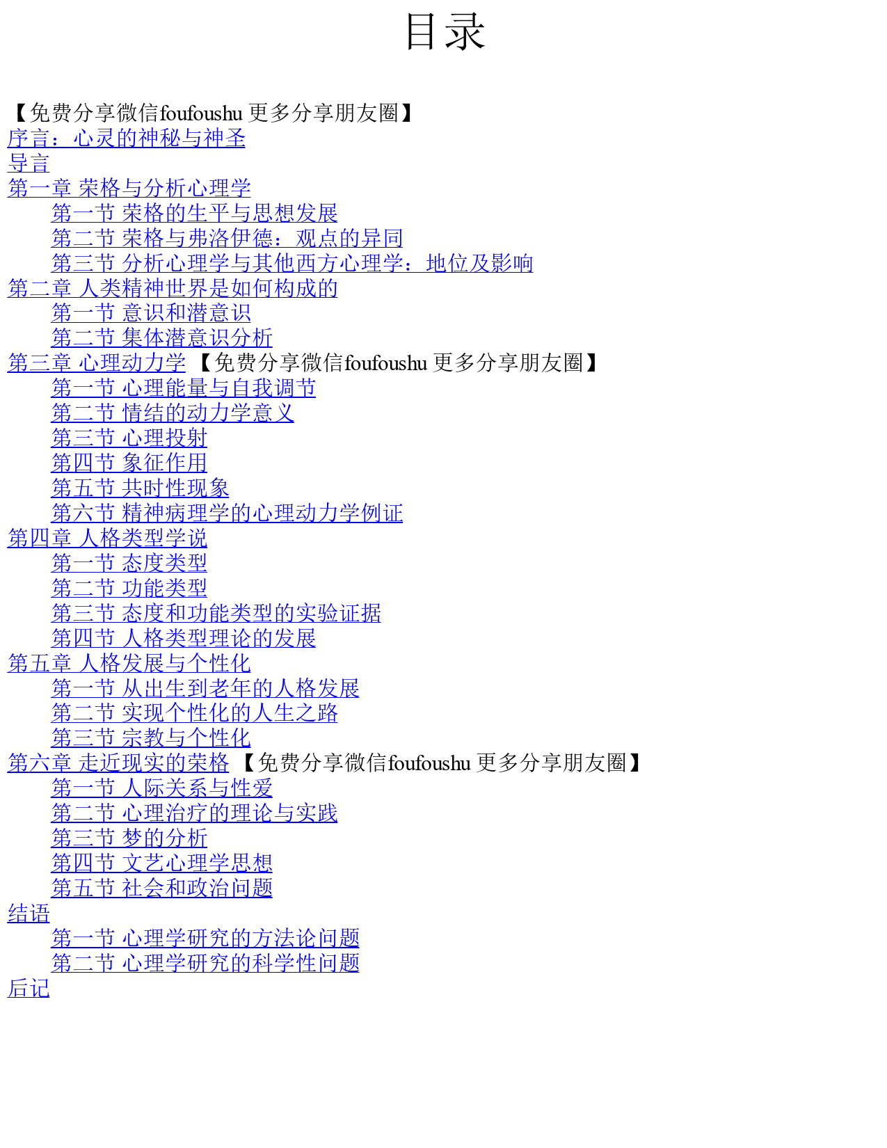 版权信息书名:神秘的荣格作者:杨韶刚出版社:江西人民出版社出版时间:2017年3月ISBN:9787210075097版权所有侵权必究目录【免费分享微信foufoushu更多分享朋友圈】序言:心灵的神秘与神圣导言第一章荣格与分析心理学第一节荣格的生平与思想发展第二节荣格与弗洛伊德:观点的异同第三节分析心理学与其他西方心理学:地位及影响第二章人类精神世界是如何构成的第一节意识和潜意识第二节集体潜意识分析第三章心理动力学【免费分享微信foufoushu更多分享朋友圈】第一节心理能量与自我调节第二节情结的动力学意义第三节心理投射第四节象征作用第五节共时性现象第六节精神病理学的心理动力学例证第四章人格类型学说第一节态度类型第二节功能类型第三节态度和功能类型的实验证据第四节人格类型理论的发展第五章人格发展...