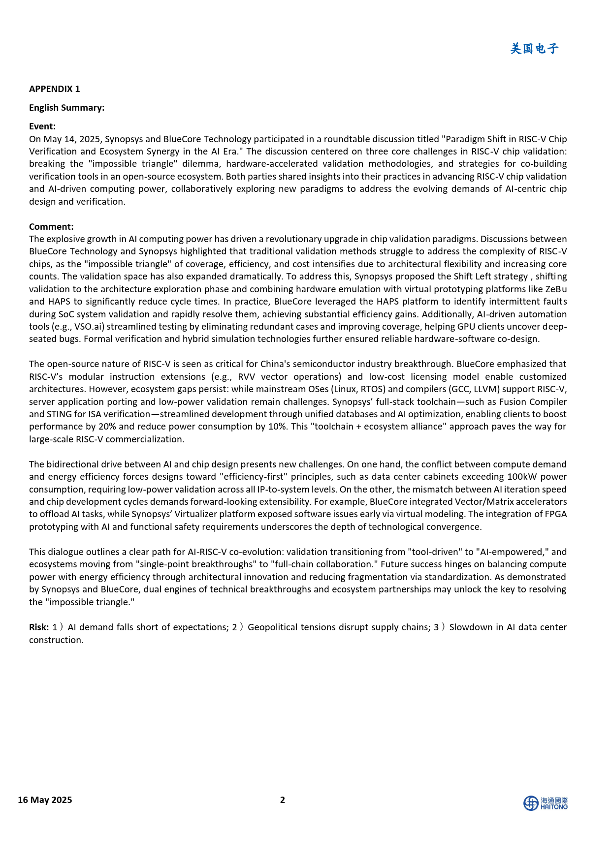 wReos[eTaarbclhe_RTeiptloer]t16May2025美国电子USTechnologyAI算力革命下的RISC-V芯片验证革新:范式突破、技术路径与生态共融RISC-VChipVerificationInnovationundertheAIComputingPowerRevolution:ParadigmBreakthrough,TechnicalPathways,andEcologicalIntegration姚书桥BarneyYao邓雅文LindaDengbarney.sq.yao@htisec.comlinda.yw.deng@htisec.com[FTlasbhleA_nyaelmyseisi1][事Ta件ble:_summary]2025年5月14日,Synopsys与蓝芯算力参与《AI时代,RISC-V芯片验证范式革命与生态共融》圆桌对谈。本次对谈聚焦于RISC-V芯片验证领域的三大核心议题:如何破解RISC-V芯片验证中的“不可能三角”困局、硬件加速验证的技术路径、以及开源生态下的验证工具共建的策略,分享了各自在RISC-V芯片验证和推动AI算力发展...