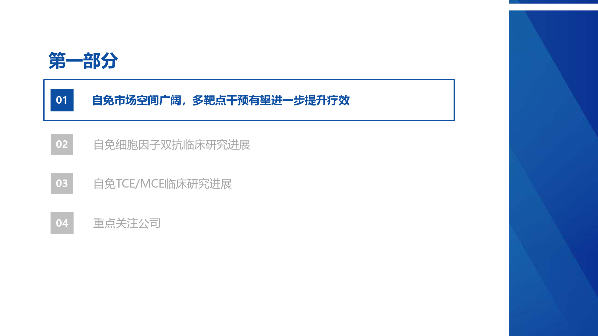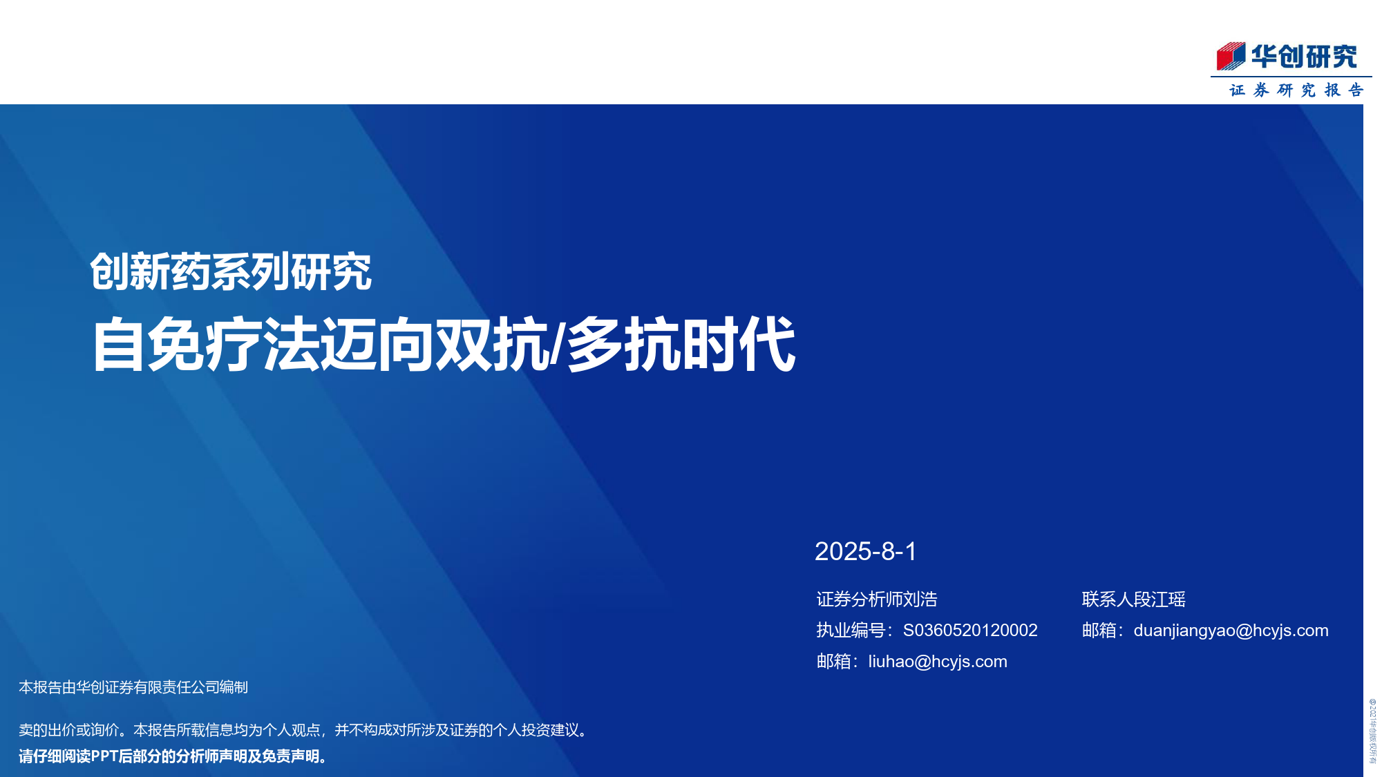 证券研究报告创新药系列研究自免疗法迈向双抗/多抗时代2025-8-1联系人段江瑶邮箱:duanjiangyao@hcyjs.com证券分析师刘浩执业编号:S0360520120002邮箱:liuhao@hcyjs.com本报告由华创证券有限责任公司编制@2021华创版权所有卖的出价或询价。本报告所载信息均为个人观点,并不构成对所涉及证券的个人投资建议。请仔细阅读PPT后部分的分析师声明及免责声明。免责申明:行业报告资源群1.本资料来源于网络公开渠1.进群福利:进群即领万份行业研究、管理方案及其他道,版权归属版权方;学习资源,直接打包下载2.本资料仅限会员学习使用,2.每日分享:6+份行研精选、3个行业主题如他用请联系版权方;3.报告查找:群里直接咨询,免费协助查找4.严禁广告:仅限行业报告交流,禁止一切无关信息3.会员费用作为信息收集整理...