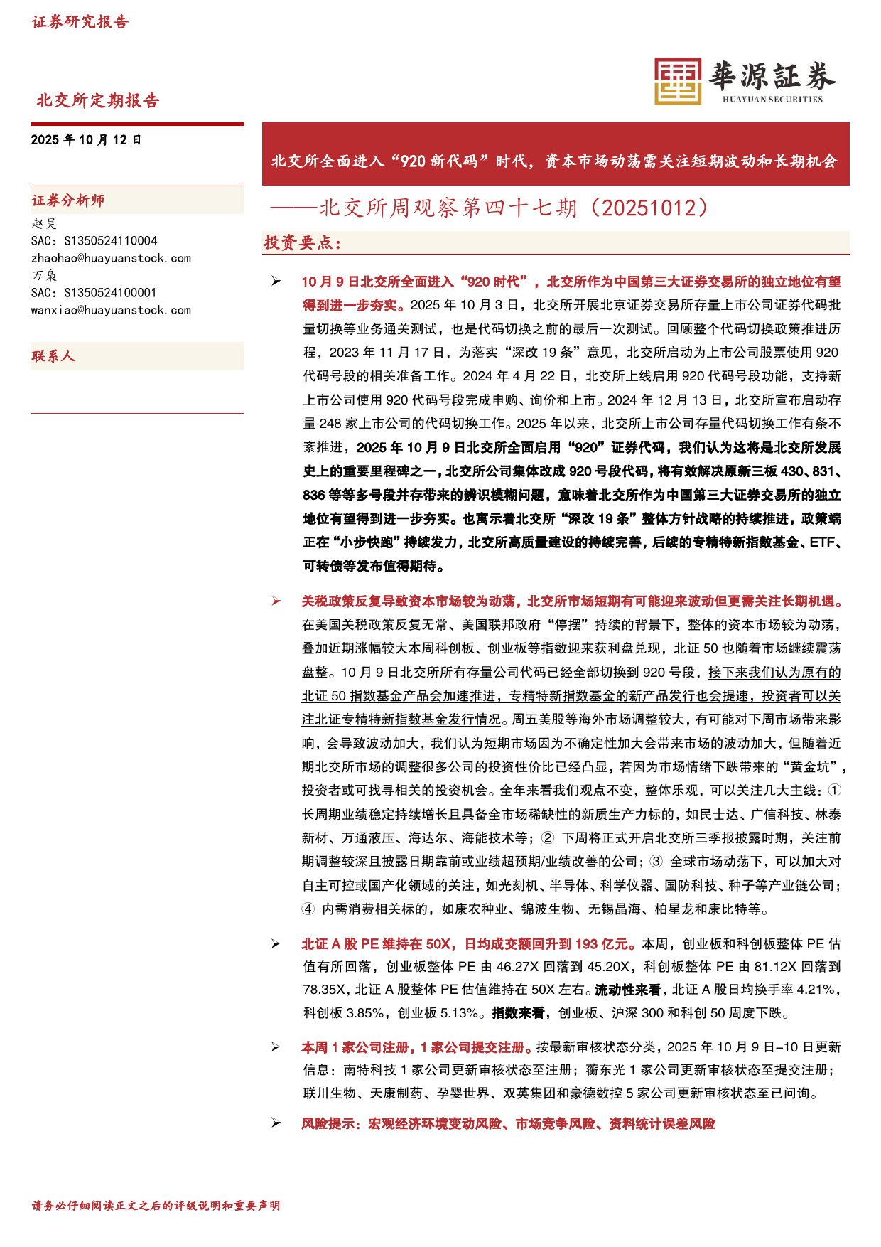 证券研究报告北交所全面进入“920新代码”时代,资本市场动荡需关注短期波动和长期机会北交所定期报告——北交所周观察第四十七期(20251012)h20y2z5qd年at1e0m月ark12日投资要点:证券分析师10月9日北交所全面进入“920时代”,北交所作为中国第三大证券交易所的独立地位有望赵昊得到进一步夯实。2025年10月3日,北交所开展北京证券交易所存量上市公司证券代码批SAC:S1350524110004量切换等业务通关测试,也是代码切换之前的最后一次测试。回顾整个代码切换政策推进历zhaohao@huayuanstock.com程,2023年11月17日,为落实“深改19条”意见,北交所启动为上市公司股票使用920万枭代码号段的相关准备工作。2024年4月22日,北交所上线启用920代码号段功能,支持新SAC:S1350524100001上市公司使用920代码号段完...