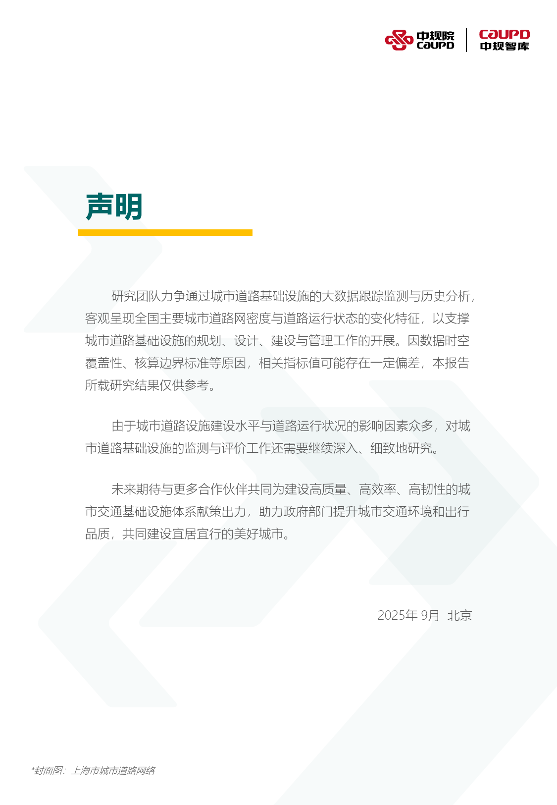 中国主要城市道路网密度与运行状态监测报告2025年度每日免费获取报告1、每日微信群内分享8+最新重磅报告;2、每日分享当日华尔街日报、金融时报;3、每周分享经济学人4、行研报告均为公开版,权利归原作者所有,小马财经仅分发做内部学习。扫一扫二维码关注公众号回复:研究报告加入“小马财经”微信群。声明研究团队力争通过城市道路基础设施的大数据跟踪监测与历史分析,客观呈现全国主要城市道路网密度与道路运行状态的变化特征,以支撑城市道路基础设施的规划、设计、建设与管理工作的开展。因数据时空覆盖性、核算边界标准等原因,相关指标值可能存在一定偏差,本报告所载研究结果仅供参考。由于城市道路设施建设水平与道路运行状况的影响因素众多,对城市道路基础设施的监测与评价工作还需要继续深入、细致...