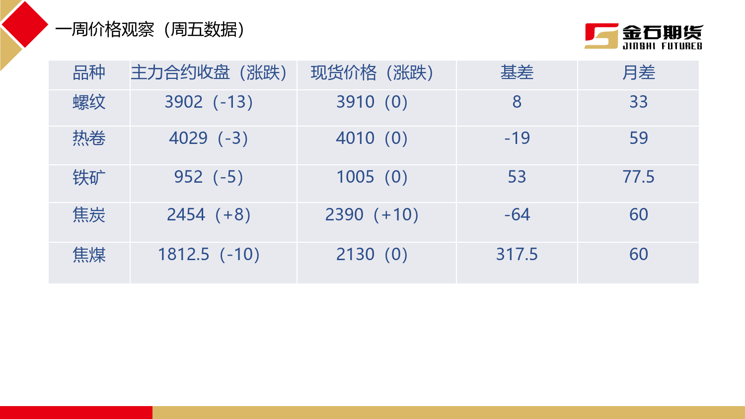 钢材供需进入淡季,宏观情绪影响明显2023年1月22日钱龙从业资格证号:F3077614投资咨询资格证号:Z0017608免费每日微信群内分享7+最新重磅报告;获取每日分享当日华尔街日报、金融时报;报告行研报告均为公开版,权利归原作者所有,起点财经仅分发做内部学习。扫⼀一扫⼆二维码关注公号回复:“研究报告”加⼊入“起点财经”微信群一周价格观察(周五数据)品种主力合约收盘(涨跌)现货价格(涨跌)基差月差螺纹3902(-13)3910(0)833热卷4029(-3)4010(0)-1959铁矿952(-5)1005(0)5377.5焦炭2454(+8)2390(+10)-6460焦煤1812.5(-10)2130(0)317.560逻辑及策略上周黑色市场整体平稳震荡运行,进入春节前的价格偏稳模式。相较钢材而言,铁矿、双焦表现略强,价格偏强震荡,钢厂存在一定备货意愿。螺纹钢...