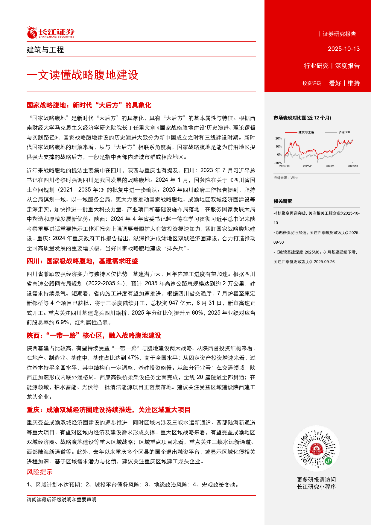 %%research.95579.com国际资本市场研报资讯+V:quanqiuzixu%n%8行业研究丨深度报告丨建筑与工程[一Ta文b读le_懂T战itle略]腹地建设%%1%%%%research.95579.com国际资本市场研报资讯+V:quanqiuzixu%n%8丨证券研究报告丨报告要点[近Ta年bl来e_战Su略m腹m地ar的y]提法主要集中在四川,陕西与重庆也有提及。四川:2023年7月习近平总书记在四川考察时强调四川是我国发展的战略腹地。2024年1月,国务院在关于《四川省国土空间规划(2021—2035年)》的批复中进一步确认。陕西:2024年4年省委书记赵一德在学习贯彻习近平总书记来陕考察重要讲话重要指示工作汇报会上强调要着眼扩大有效投资提速加力,紧盯国家战略腹地建设。重庆:2024年重庆政府工作报告指出,纵深推进成渝地区双城经济圈建设,合力打造推动全国高质量发展...