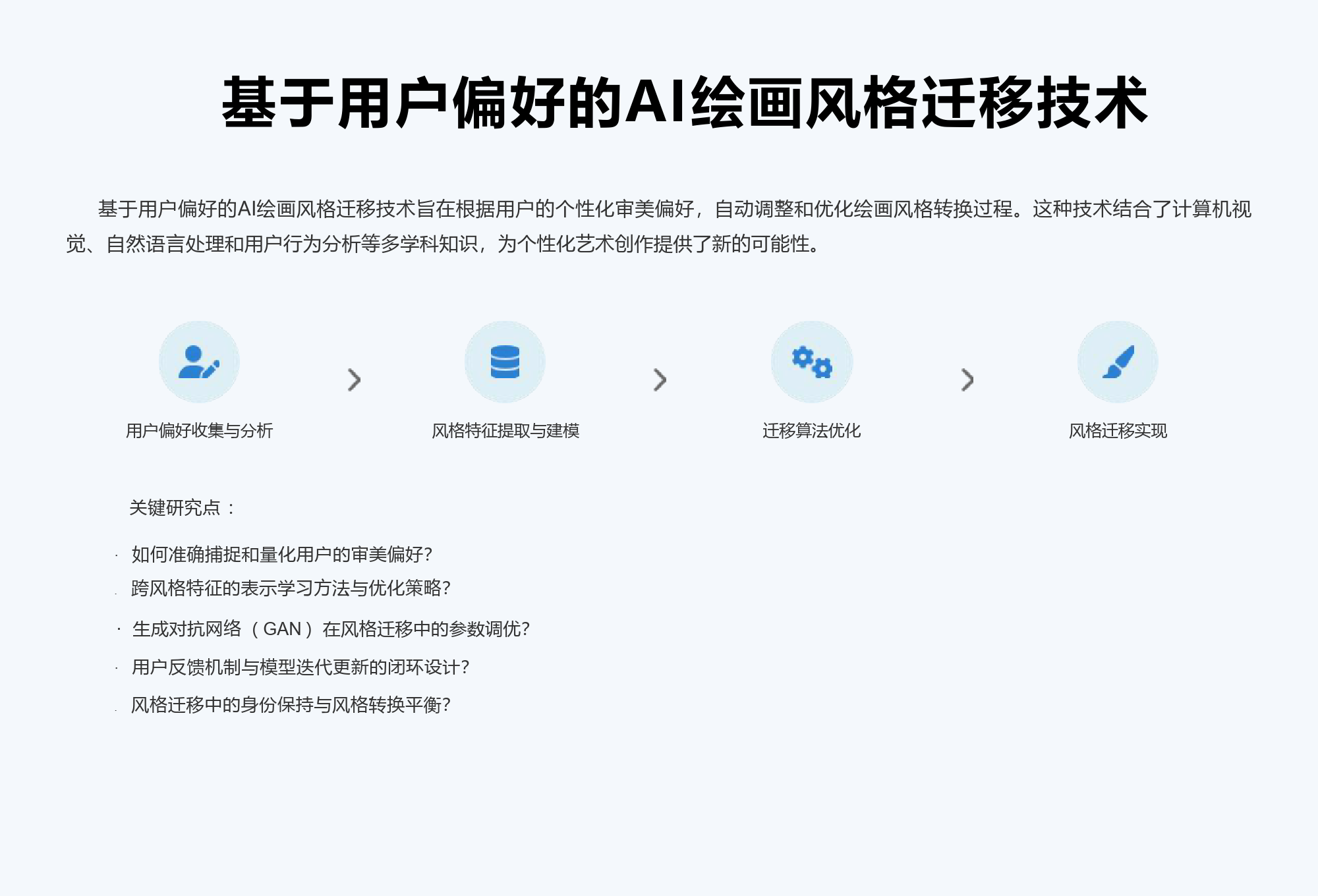 AI艺术的问题思考AI自动生成幻灯片素材试验-1(1.0版修订号0.1)2025年8月基于用户偏好的AI绘画风格迁移技术基于用户偏好的AI绘画风格迁移技术旨在根据用户的个性化审美偏好,自动调整和优化绘画风格转换过程。这种技术结合了计算机视觉、自然语言处理和用户行为分析等多学科知识,为个性化艺术创作提供了新的可能性。用户偏好收集与分析风格特征提取与建模迁移算法优化风格迁移实现关键研究点:·如何准确捕捉和量化用户的审美偏好?.跨风格特征的表示学习方法与优化策略?·生成对抗网络(GAN)在风格迁移中的参数调优?·用户反馈机制与模型迭代更新的闭环设计?.风格迁移中的身份保持与风格转换平衡?AI绘画在儿童美术教育中的应用与前景应用效果评估方法发展前景分析创作能力评估:通过对比分析,评估AI辅助...