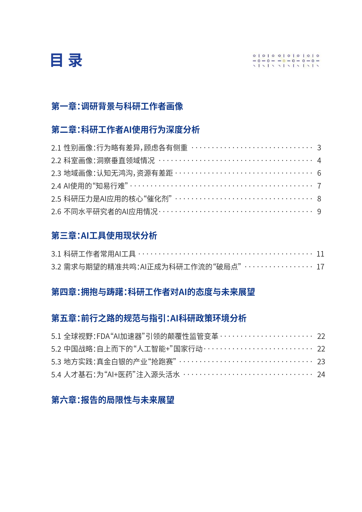 目录第一章:调研背景与科研工作者画像第二章:科研工作者AI使用行为深度分析2.1性别画像:行为略有差异,顾虑各有侧重······························32.2科室画像:洞察垂直领域情况······································42.3地域画像:认知无鸿沟,资源有差距··································62.4AI使用的“知易行难”·············································72.5科研压力是AI应用的核心“催化剂”··································82.6不同水平研究者的AI应用情况·················...