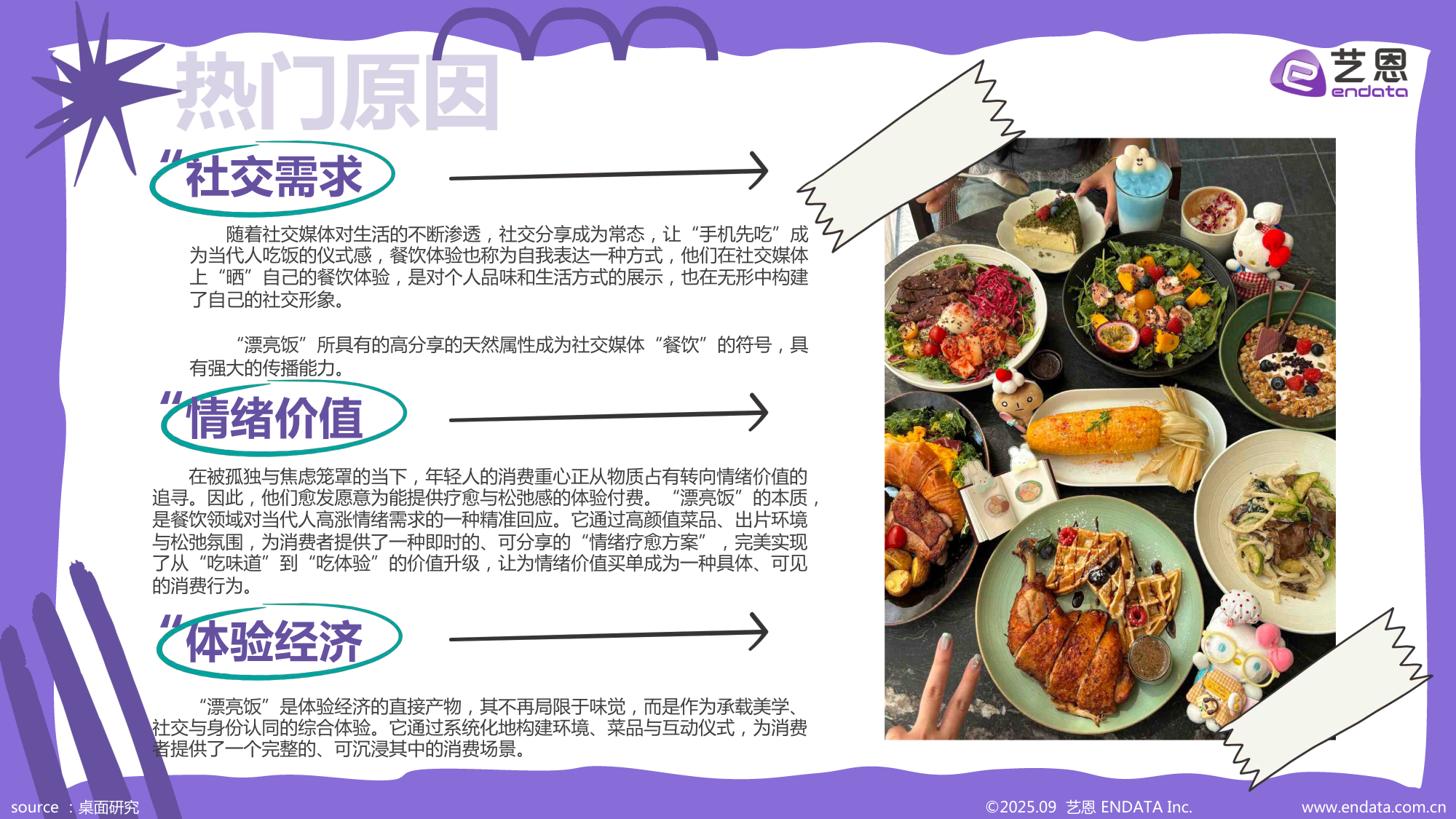 “漂亮饭”社媒观察报告2025年9月艺恩出品近年来,“漂亮饭”凭借其精致的摆盘与出众的视觉呈现,逐渐成为越来越多年轻人就餐时的首选。不论是浪漫约会、朋友聚餐,还是日常用餐,这种兼具社交属性与颜值体验的餐饮形式,在市场中迅速崛起,备受青睐。越来越多的餐饮品牌也借势这股“漂亮饭”风潮成功出圈。传统地方菜系的创新演绎、餐食结构的创意组合、用餐空间的视觉化设计,共同构成了“漂亮饭”潮流下最为显著的行业变革。本报告将从“漂亮饭”的社交表达出发,剖析其发展现状与走红背后的驱动因素。source:桌面研究©2025.09艺恩ENDATAInc.www.endata.com.cn“社交需求©2025.09艺恩ENDATAInc.www.endata.com.cn随着社交媒体对生活的不断渗透,社交分享成为常态,让“手机先吃”成为当代人吃饭的仪式感,餐...