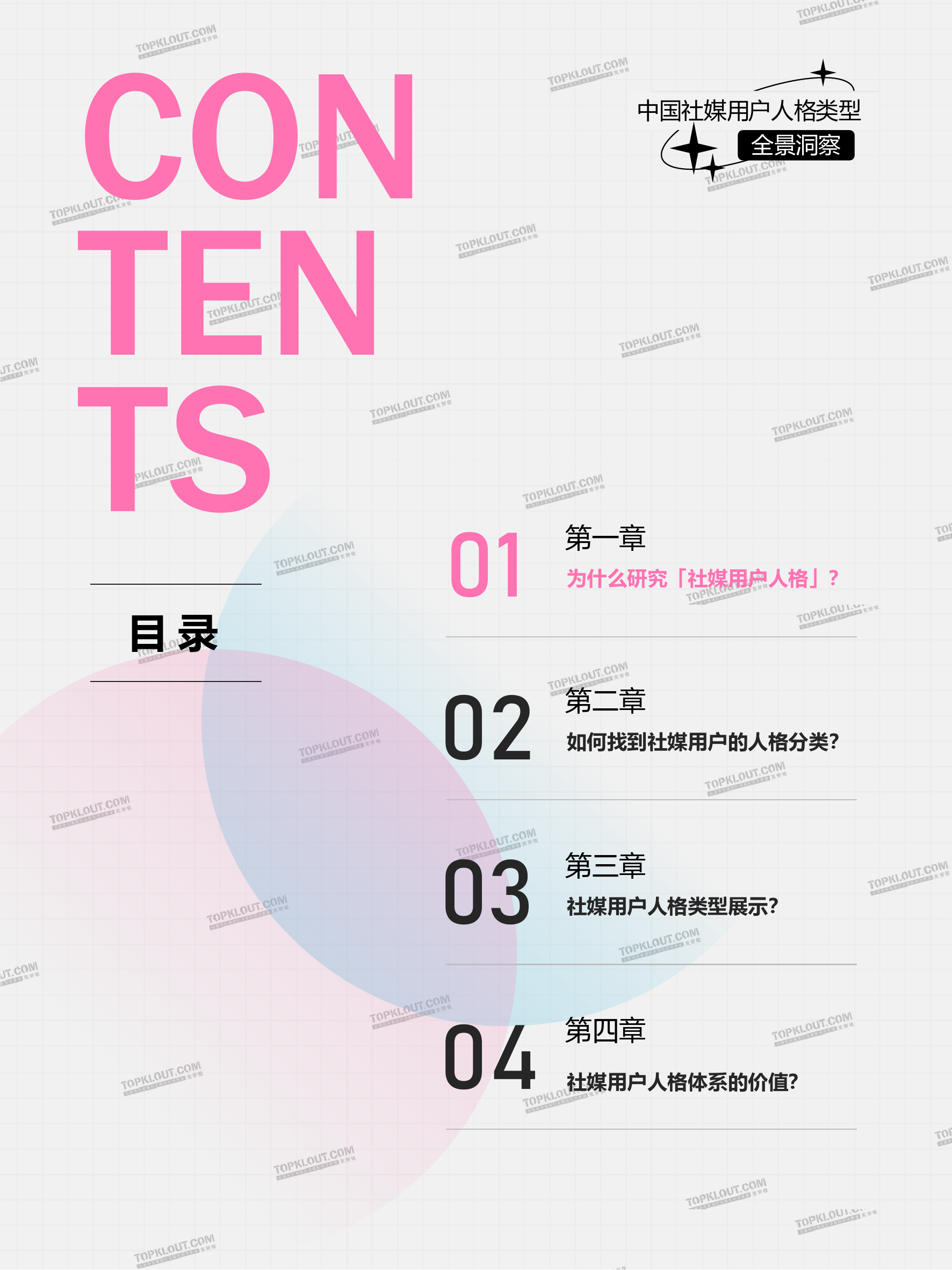 每日免费获取报告1、每日微信群内分享8+最新重磅报告;2、每日分享当日华尔街日报、金融时报;3、每周分享经济学人4、行研报告均为公开版,权利归原作者所有,小马财经仅分发做内部学习。扫一扫二维码关注公众号回复:研究报告加入“小马财经”微信群。CON中国社媒用户人格类型TEN全景洞察TS第一章01为什么研究「社媒用户人格」?目录02第二章如何找到社媒用户的人格分类?03第三章社媒用户人格类型展示?04第四章社媒用户人格体系的价值?线上人格≠线下人格:场域对人的行为影响力远超我们想象线下人格是「基态」,线上人格是「激发态」衡量「基态」的标尺难以精准测量「激发态」「线上」场域用户更趋近于「第一性选择」信息茧房高刺激即时社会反馈解除社会抑制算法推荐海量内容转赞评匿名性解放了用户的行为限...