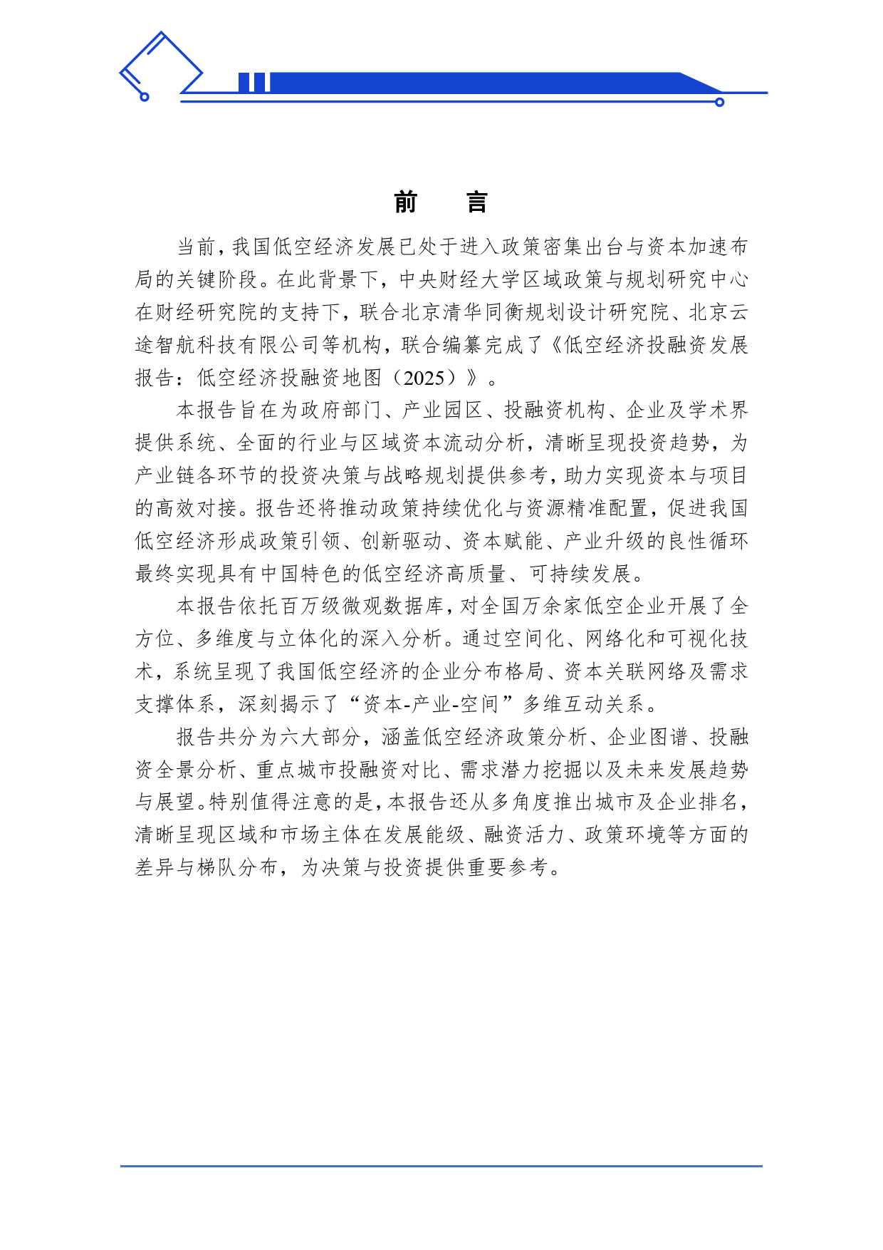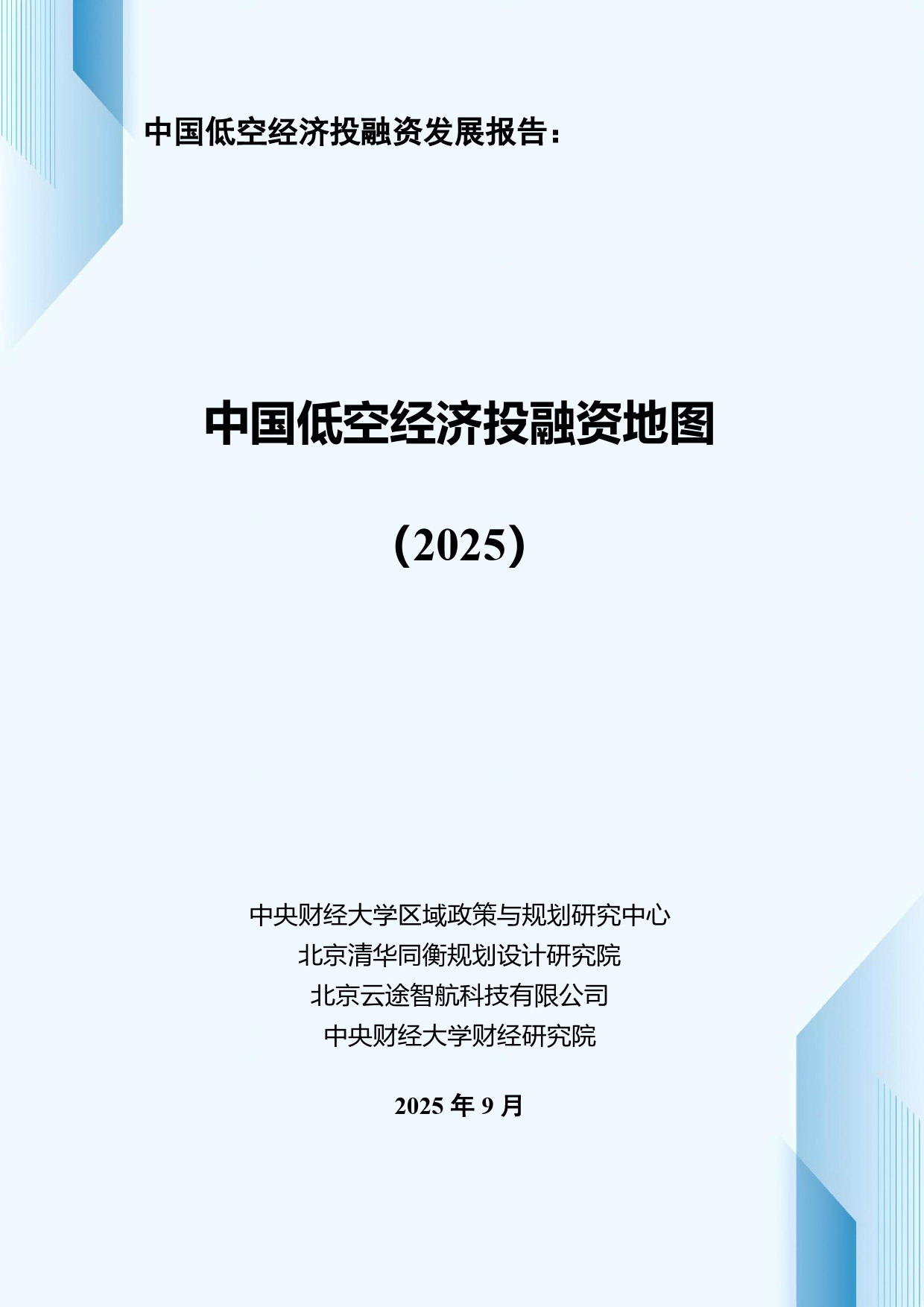 中国低空经济投融资发展报告:中国低空经济投融资地图(2025)中央财经大学区域政策与规划研究中心北京清华同衡规划设计研究院北京云途智航科技有限公司中央财经大学财经研究院2025年9月专家顾问曹明星,卢庆强,胡恒松,叶振宇,雷利军,郭辰阳,王丽娜,孙铮兰利东,李慧佳,宋砚秋,孙申,刘建新,胡凡,张树安,陈海东研究团队研究团队负责人:李姗姗中央财经大学区域政策与规划研究中心主任报告编写团队:赵霖清华同衡规划院智慧规划研究部主任工程师闫春红中国信息协会数字生态专业委员会副主任郭忠元中央财经大学管理科学与工程学院博士宋莹莹中央财经大学管理科学与工程学院博士技术支撑团队:杨云鹤,路子健,冯静,许馨云,杨一凡,马昕怡,陈信毅前言当前,我国低空经济发展已处于进入政策密集出台与资...