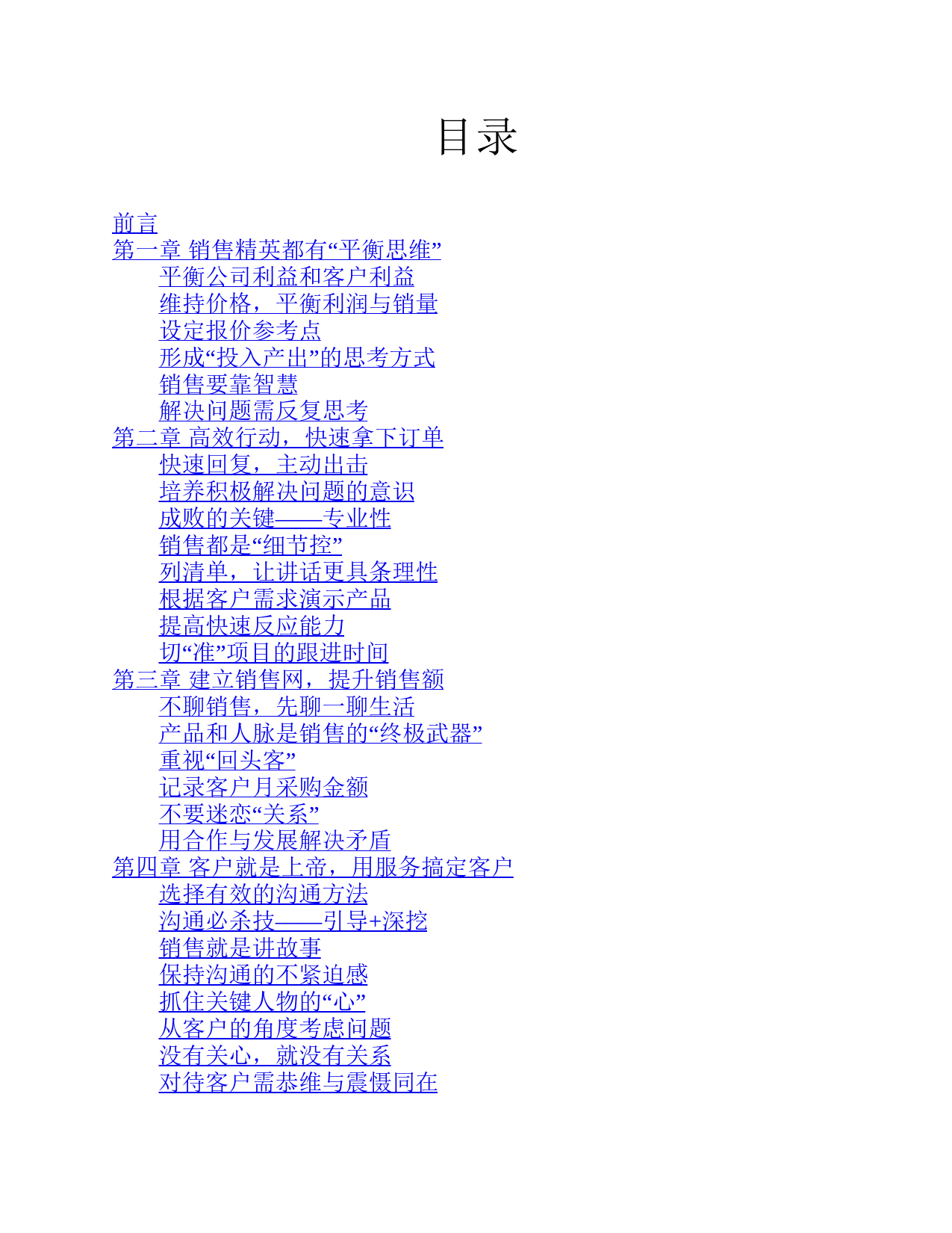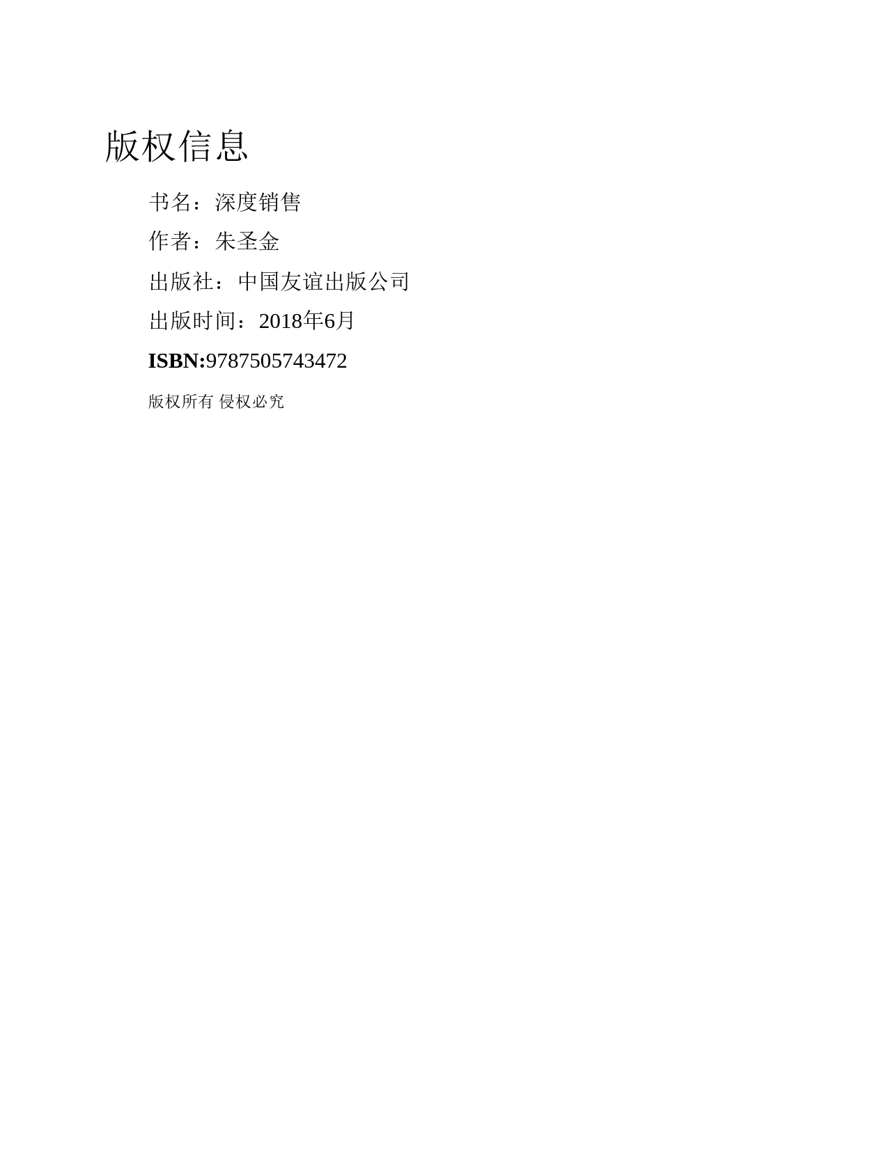 版权信息书名:深度销售作者:朱圣金出版社:中国友谊出版公司出版时间:2018年6月ISBN:9787505743472版权所有侵权必究目录前言第一章销售精英都有“平衡思维”平衡公司利益和客户利益维持价格,平衡利润与销量设定报价参考点形成“投入产出”的思考方式销售要靠智慧解决问题需反复思考第二章高效行动,快速拿下订单快速回复,主动出击培养积极解决问题的意识成败的关键——专业性销售都是“细节控”列清单,让讲话更具条理性根据客户需求演示产品提高快速反应能力切“准”项目的跟进时间第三章建立销售网,提升销售额不聊销售,先聊一聊生活产品和人脉是销售的“终极武器”重视“回头客”记录客户月采购金额不要迷恋“关系”用合作与发展解决矛盾第四章客户就是上帝,用服务搞定客户选择有效的沟通方法沟通必杀技...